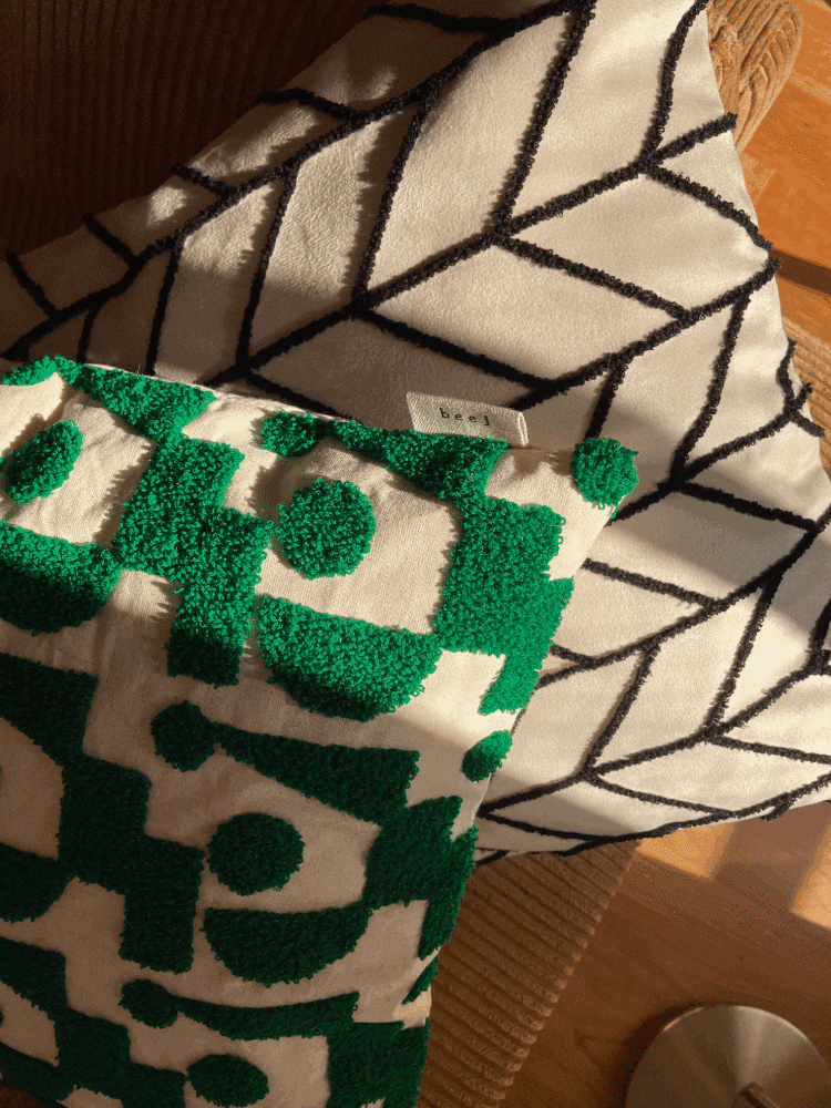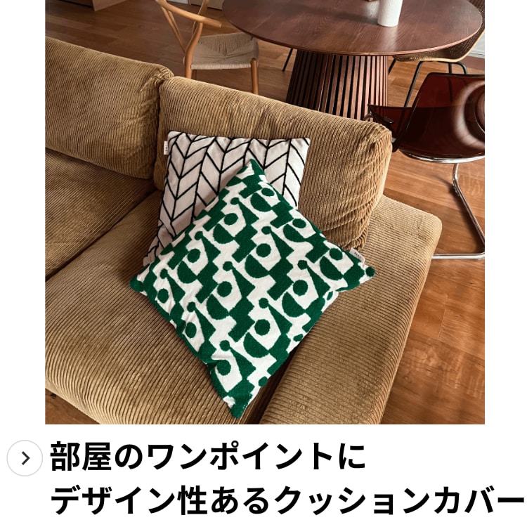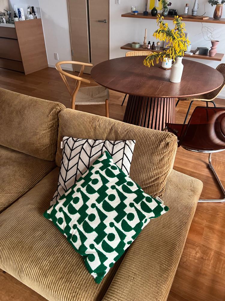 L&Bでのお取り扱いが決まってから、入荷を心待ちにしていたアイテム。自宅はフローリングも家具もウッディなものが多くブラウン味が強いので、小物でカラーを取り入れるようにしているのですが、そんなわが家に「Geometric Cushion cover」のグリーンはぴったり。一目見て、これは買いだなと即決しました。もこもと立体感のあるデザインもキュンポイントです。もうひとつは「Velour line Cushion cover」のブラック(01)を。実は元々他のデザインが気になっていたのですが、実際に手に取ると品のある滑らかなベロア生地がたまらなく可愛くて……こちらに決めました。ブラックのラインがお部屋をぐっと引き締めてくれるようで、とても気に入っています。