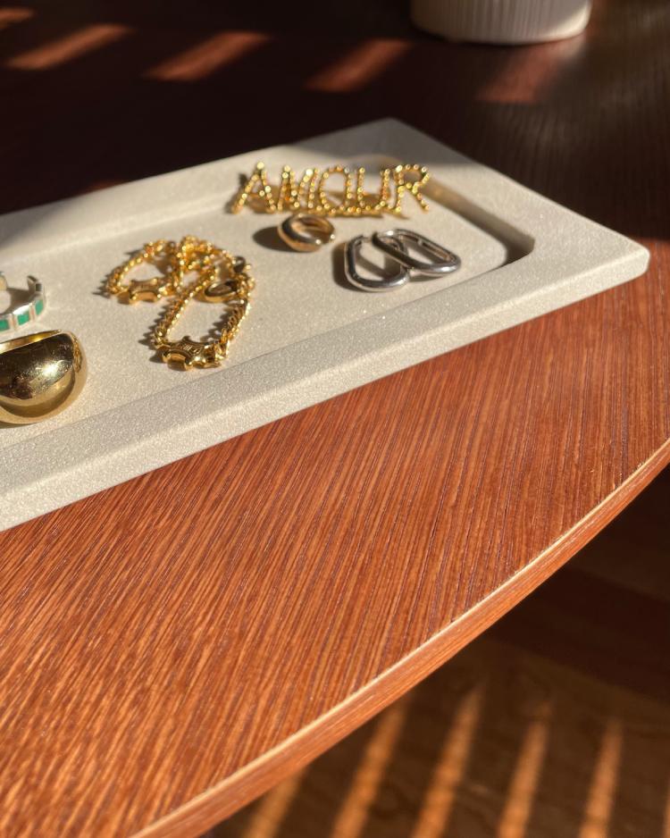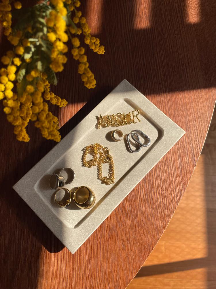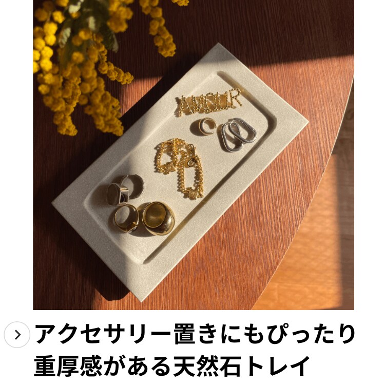 ミニマリストには程遠く、とにかく物が多いわが家。香水やコスメ、アクセサリーなど、見せる収納派な私にとってこういったトレイはいくつあっても困らないアイテム。こちらは天然の石から一点一点手作業で作られていてとても重厚感があるのに、お手頃価格なところが魅力。今は一軍アクセサリーを置いていますが、鍵置きにしたり、小瓶の香水やアロマなどを並べても可愛いなと思います。