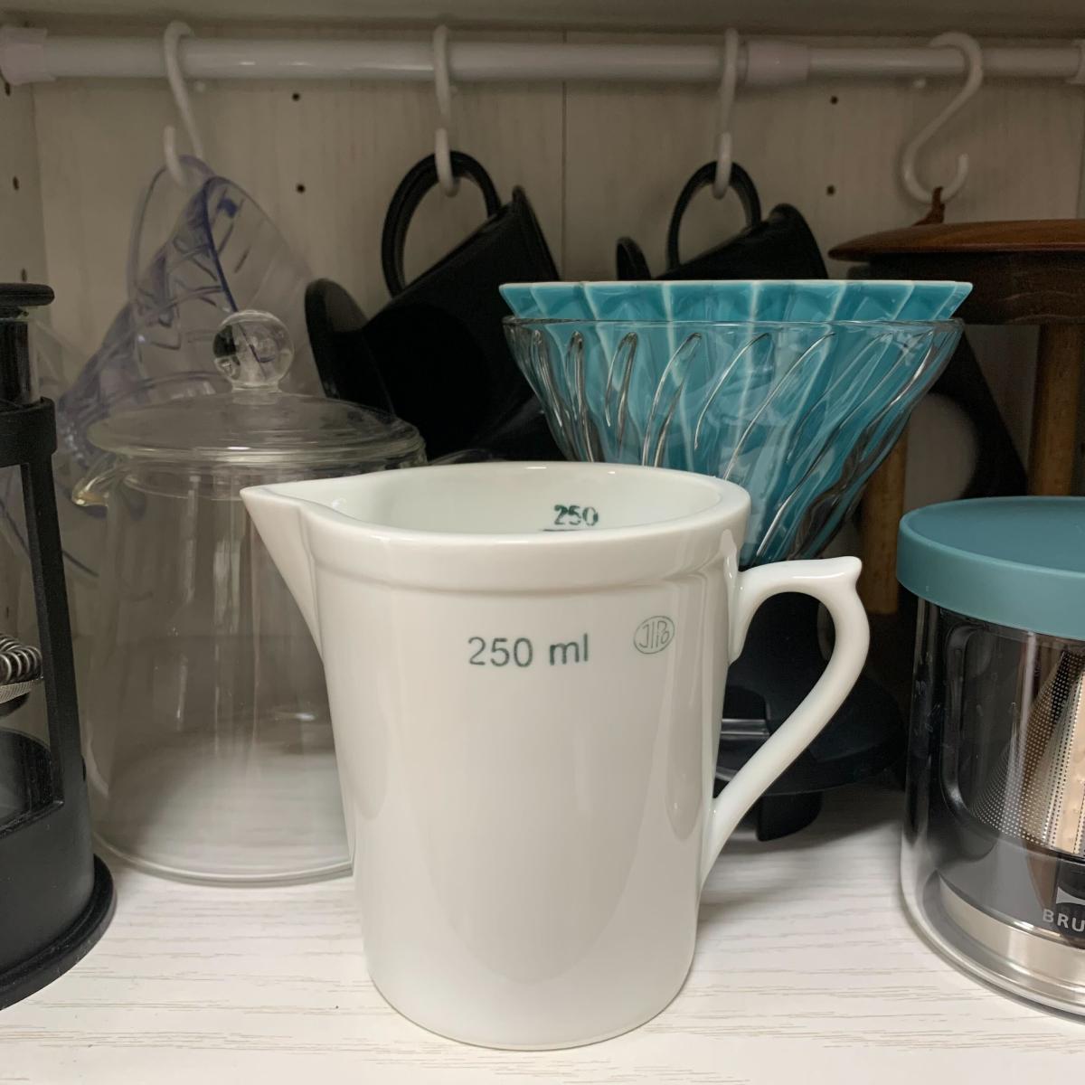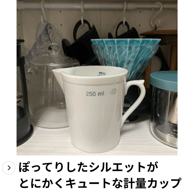 〈JIPO〉の計量カップは、とにかく見た目がかわいい! ぽってりとした厚みがあるデザインと、味のある印字がとてもお気に入りです。電子レンジ使用OKなので、牛乳などを量ってそのまま温めることができるところも便利。そのままマグカップとしても使えます。
