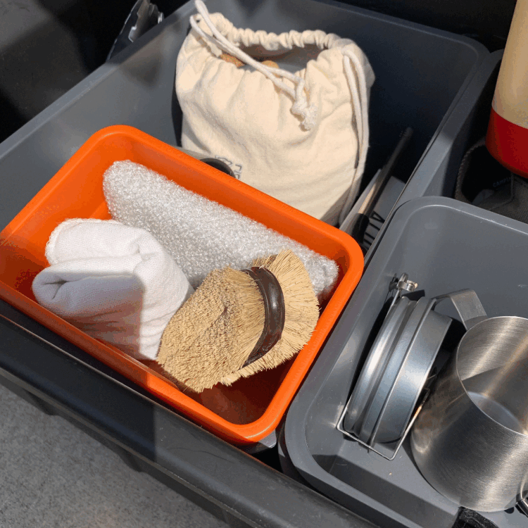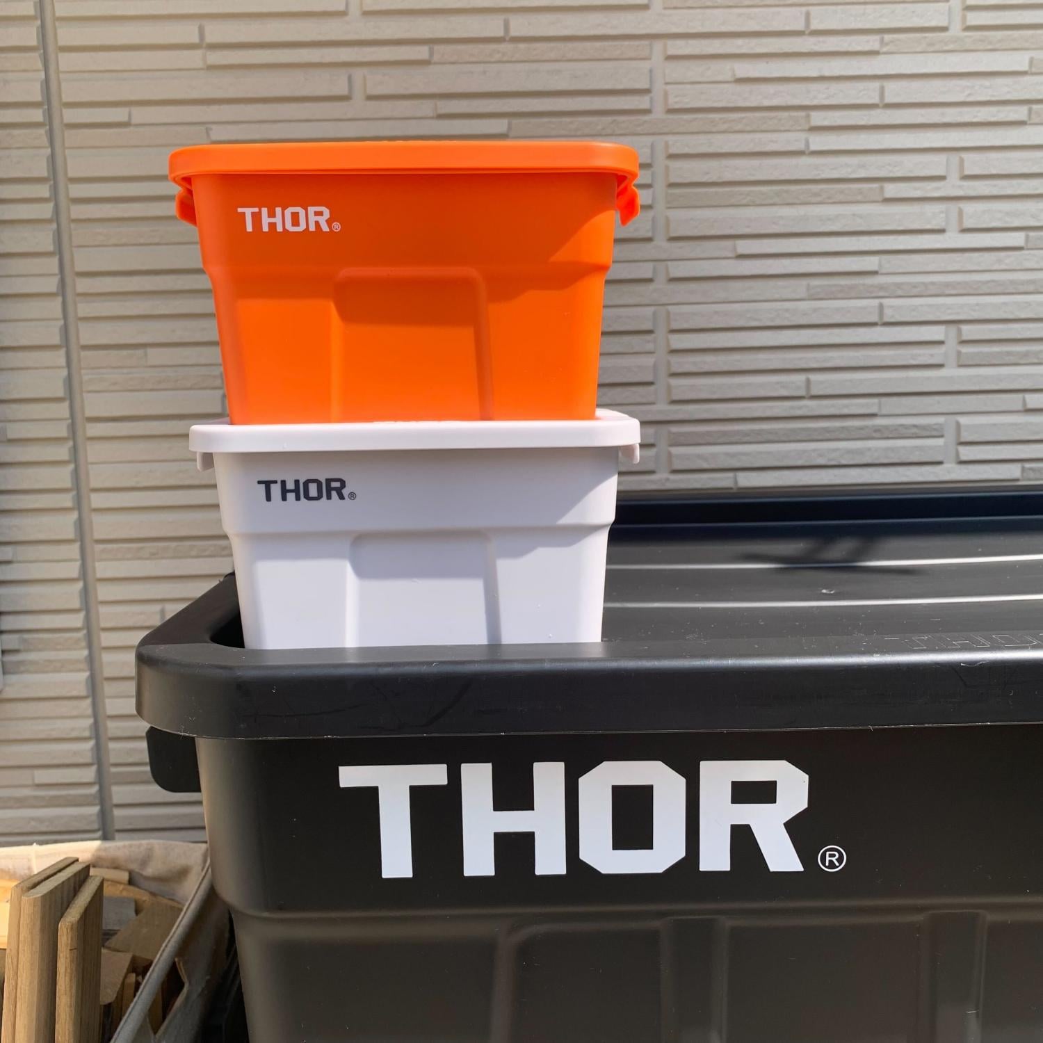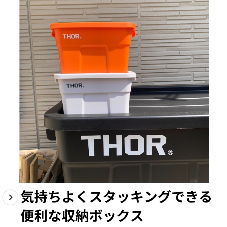 〈THOR〉のボックスはキャンプ用に購入。元々75Lのコンテナを愛用しているのですが、気持ちよくスタッキングできるので、細々としたものを入れるインナーボックスとして使っています。洗い物用のグッズや工具入れにぴったり! シャンプーやスキンケアなどのお泊りセットにも、お菓子入れにも、どんな用途にも使えてかなり便利です。