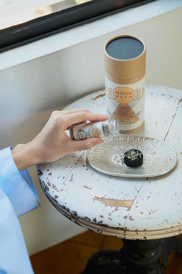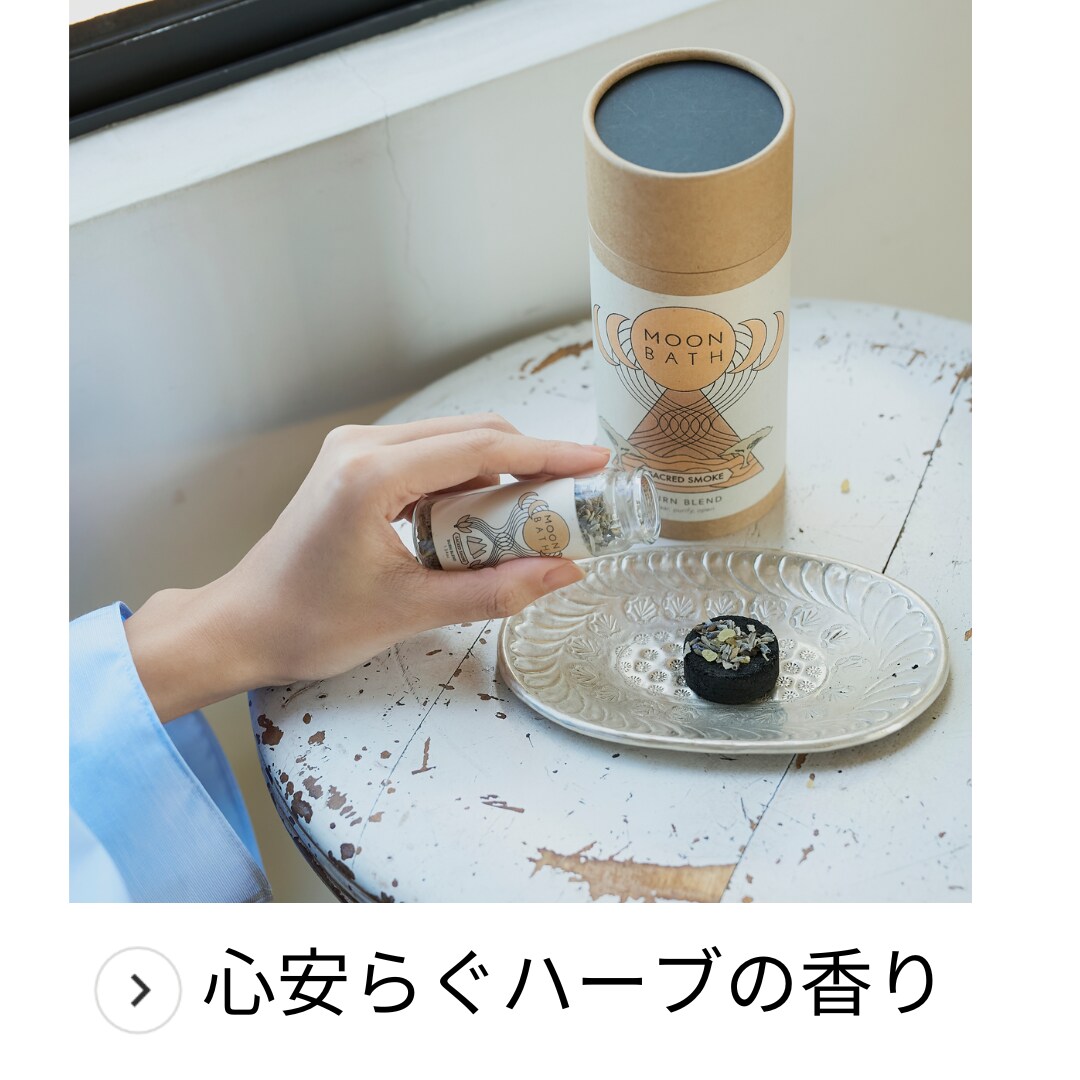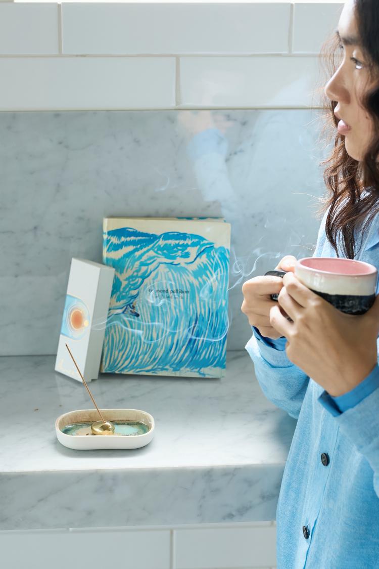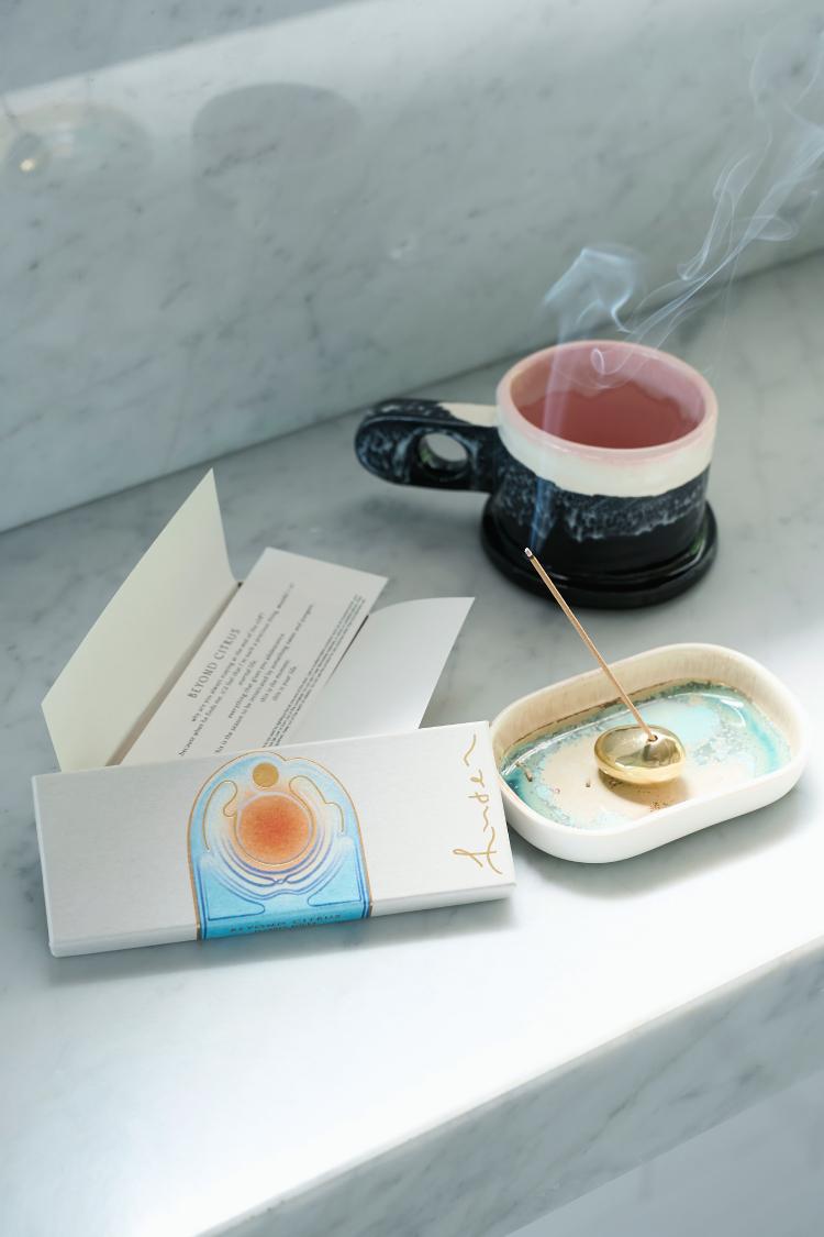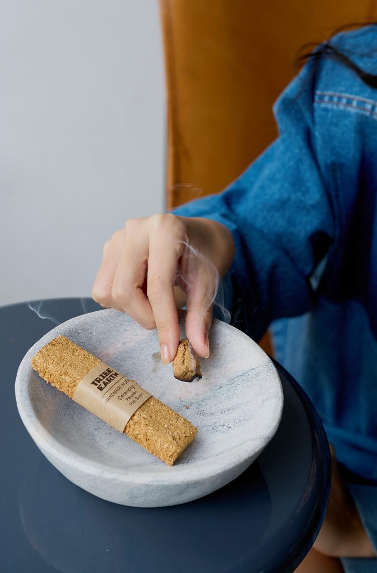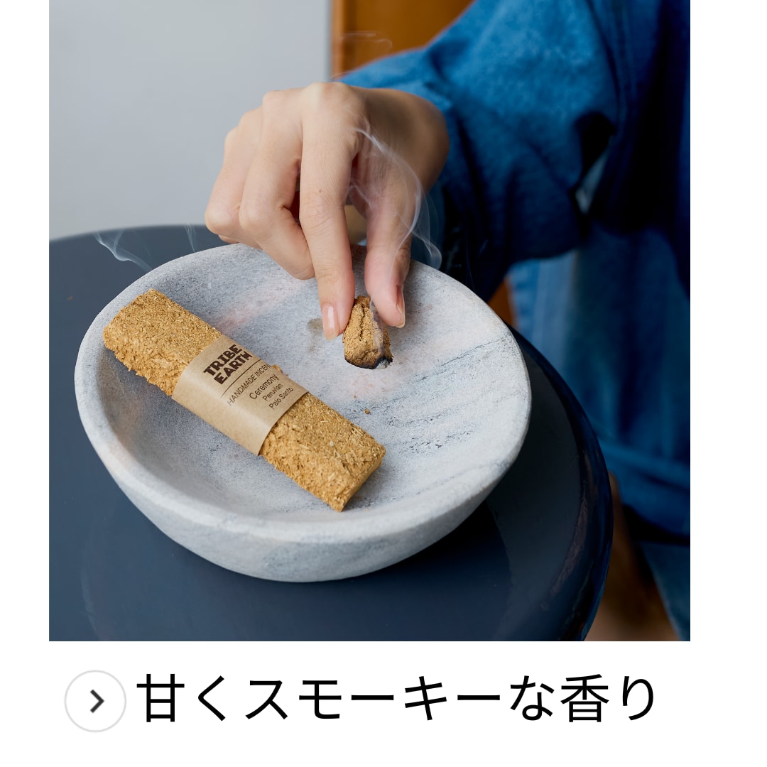 儀式に焦点を当て、スピリチュアルな思想も大切にしているオーストラリア発〈Tribe Earth(トライブアース)〉の「インセンスプランクパロサントセレモニー」は100%ペルー産の木を使用したハンドメイドで有害物質は一切不使用。小さく砕いて耐熱皿で焚くと約30〜40分燃焼した後、20分ほどスモーキーな中に甘さのある香りが広がります。受け皿として使用している〈PUEBCO(プエブコ)〉のマーブルボウルは大理石の端材を利用し、温かみのあるシェイプとどっしりとした重さで安定感も抜群。