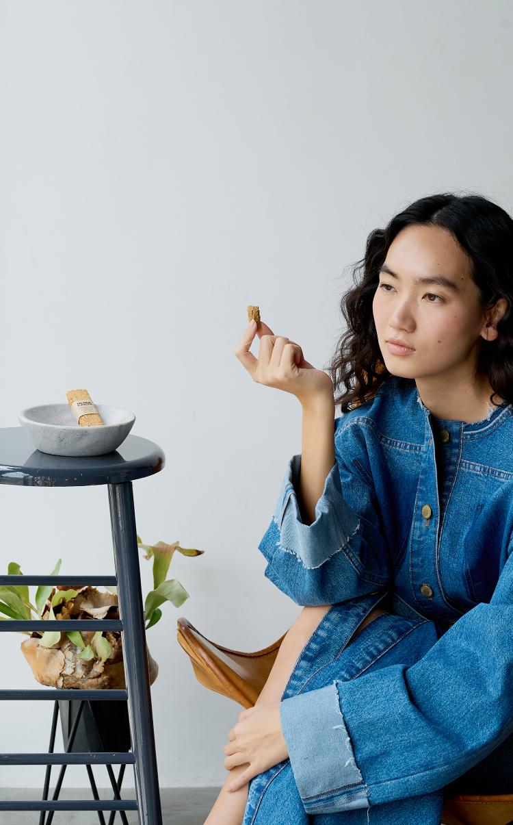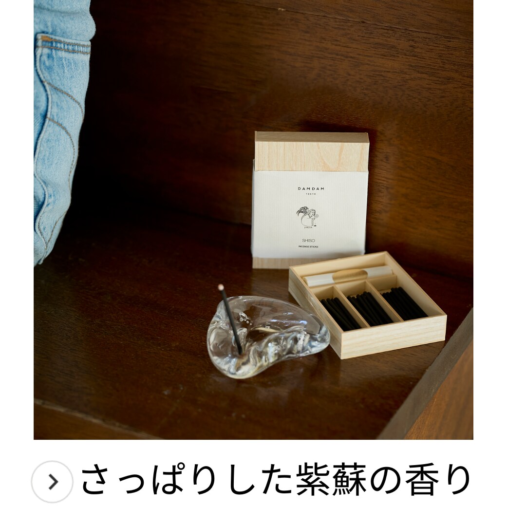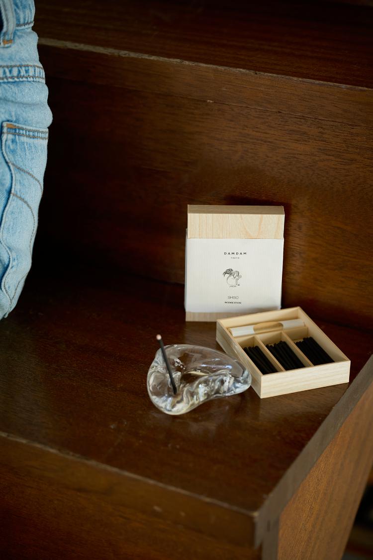 職人の手によって作られたゆっくりと燃える〈DAMDAM(ダムダム)〉のお香は、ユニークな紫蘇の香り。日本人のアイデンティティに呼応するような紫蘇のさっぱりとした香りは梅雨から初夏へ向かう季節にぴったり。