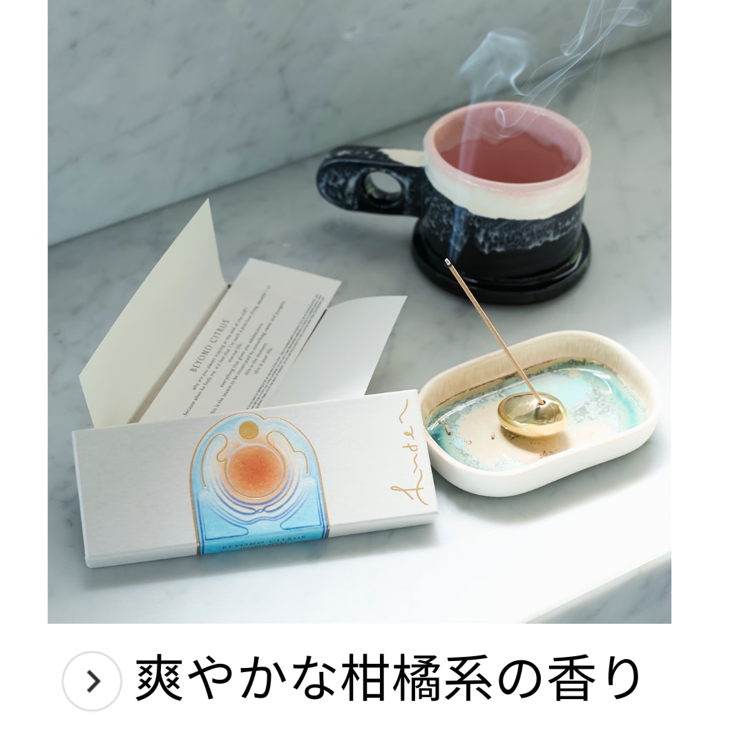 日本古来の香の文化を慈しむブランド〈Luten(ルテン)〉の「ビヨンドシトラス」はマインドをリフレッシュさせてくれる柑橘の香り。火を灯すと甘くスモーキーで深みのある香りへと変化します。香りごとに異なるメッセージカードも気分転換に一役買ってくれるはず。