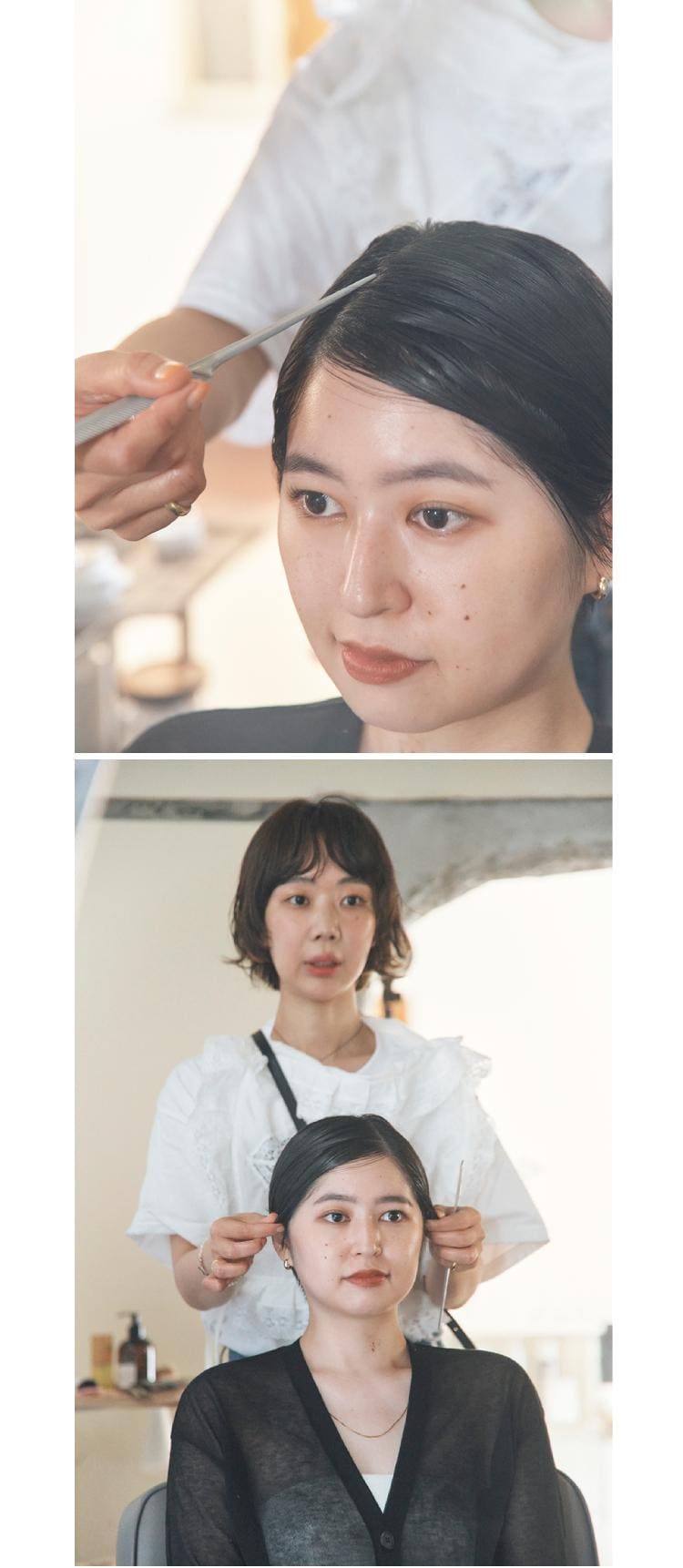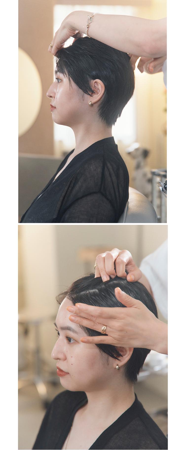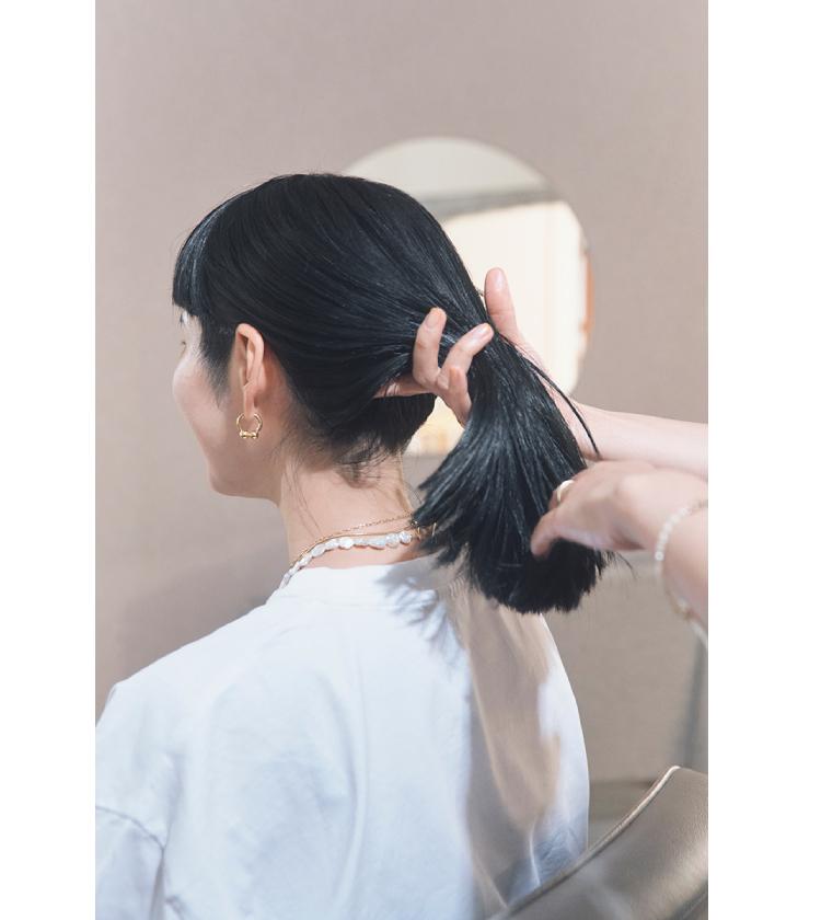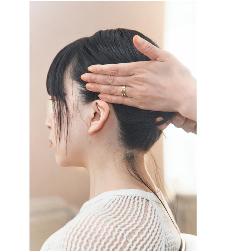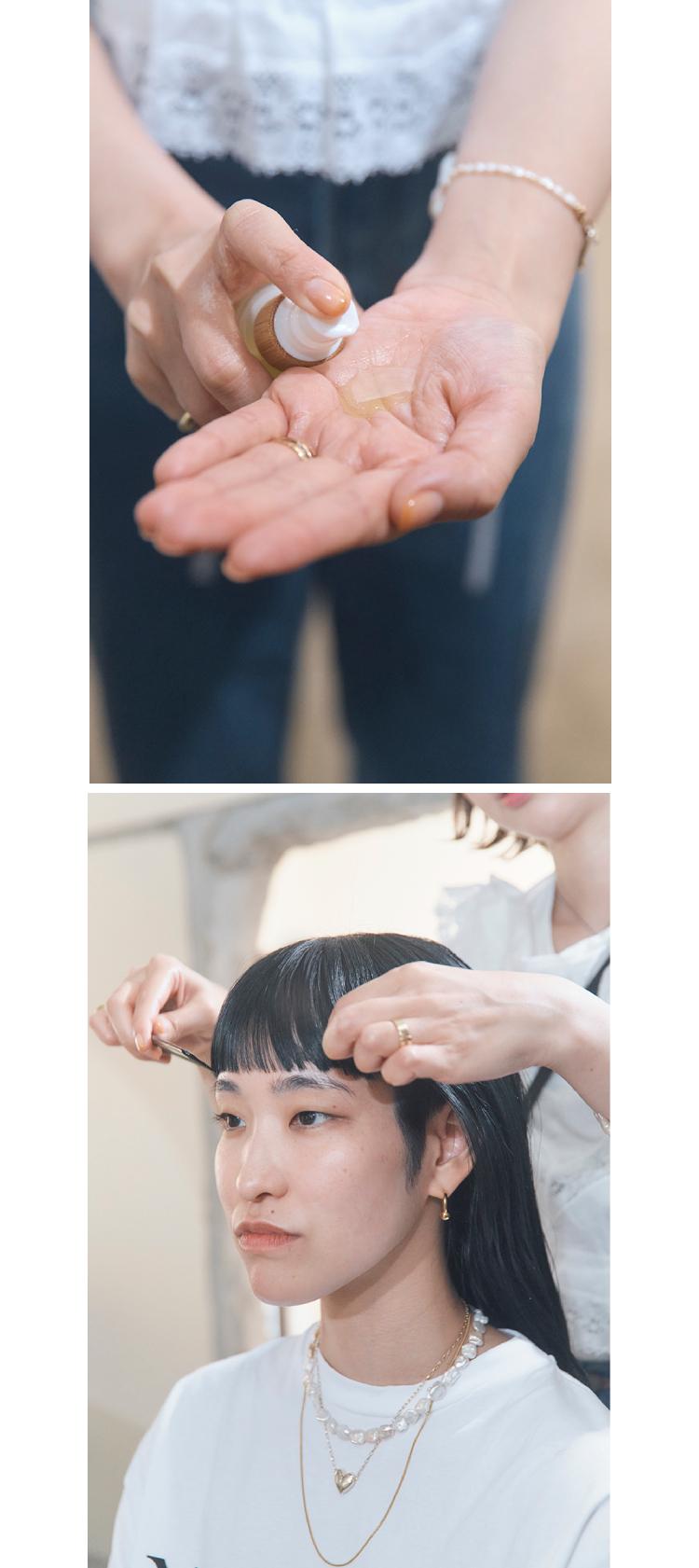 オイルを2〜3プッシュ手にとり、もみあげやうなじなど髪と肌が隣接している部分から塗布。手に残ったオイルは髪の表面に馴染ませます。前髪はオイルを内側につけすぎると、束感が出てしまうので表面に多めに塗布するのがポイントです。