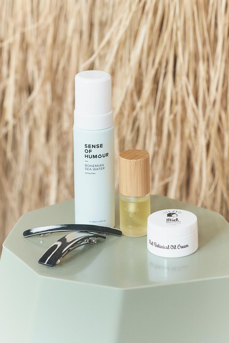 〈SENSE OF HUMOUR〉の「ボヘミアンシーウォーター」はスキンケアでいうところの化粧水のような感覚で使用。保湿力の高い〈soel(ソエル)〉の「リビングオイル フォーヘア」で栄養をプラスし、〈ideal SERIES〉の「ミエルオイルクリーム」で髪のまとまり感をアップ。