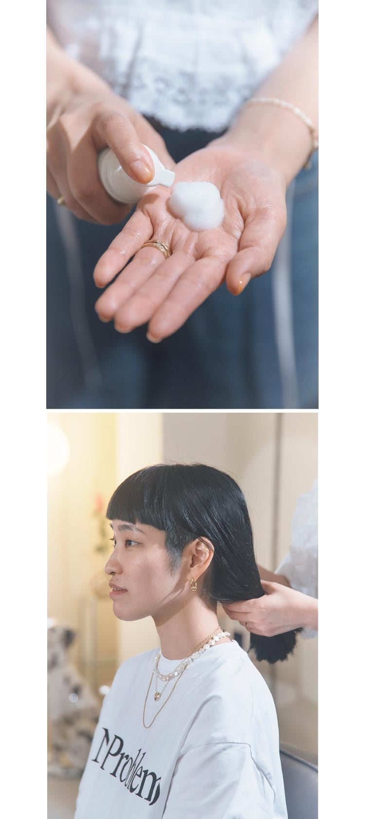 ワンプッシュしたフォームを髪全体に馴染ませ、髪に潤いをチャージします。髪の乾燥が気になる場合、まずは水分を含ませてあげるとアレンジしやすく次につけるオイルも少量で済むのでおすすめです。