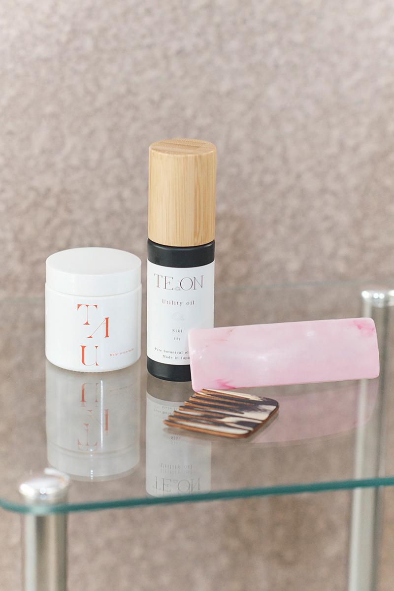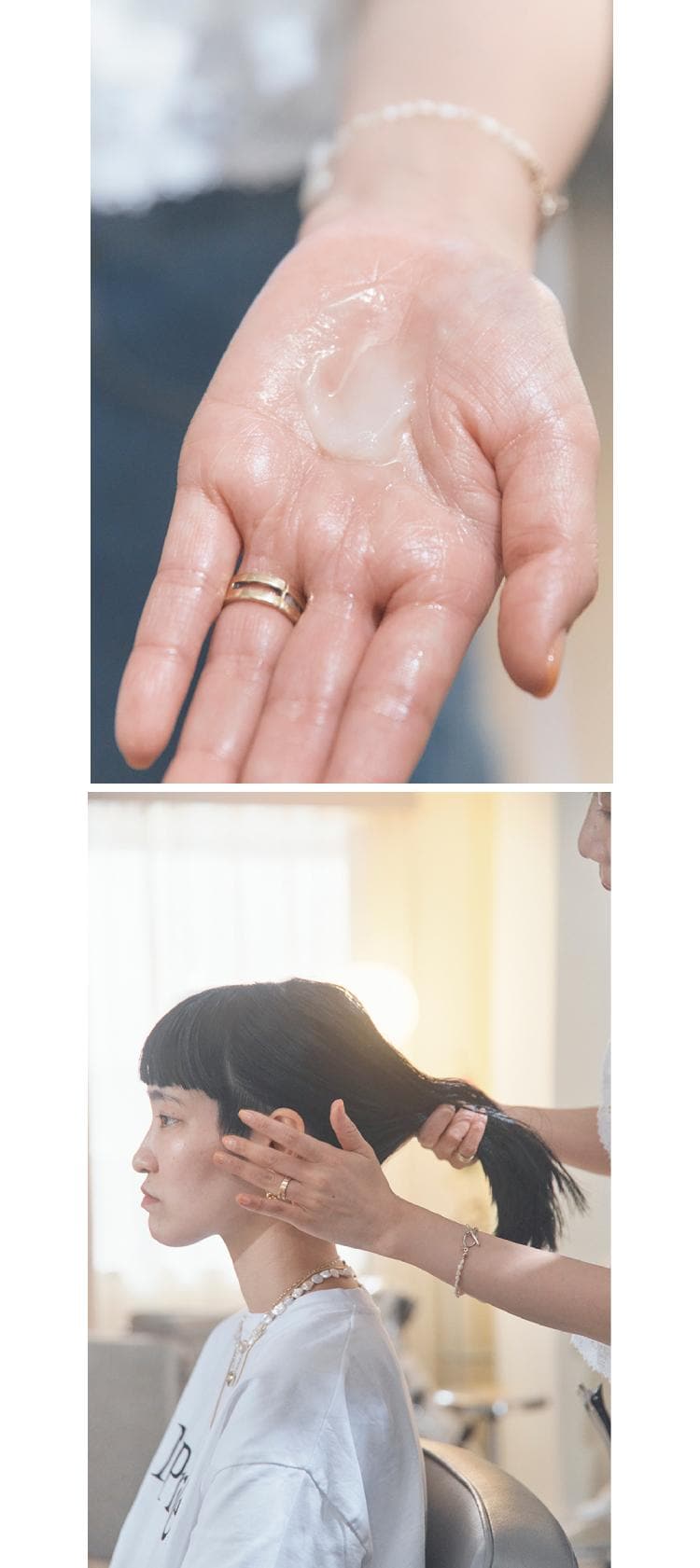 まず、気になるゴワつきには〈TE.ON(テオン)〉の「ユーティリティオイル」を。髪表面をコーティングしてサラサラにした後、軽さを残した仕上がりになる〈TAU(タウ)〉の「モイストセラムバーム」を使用しまとまり感アップ。