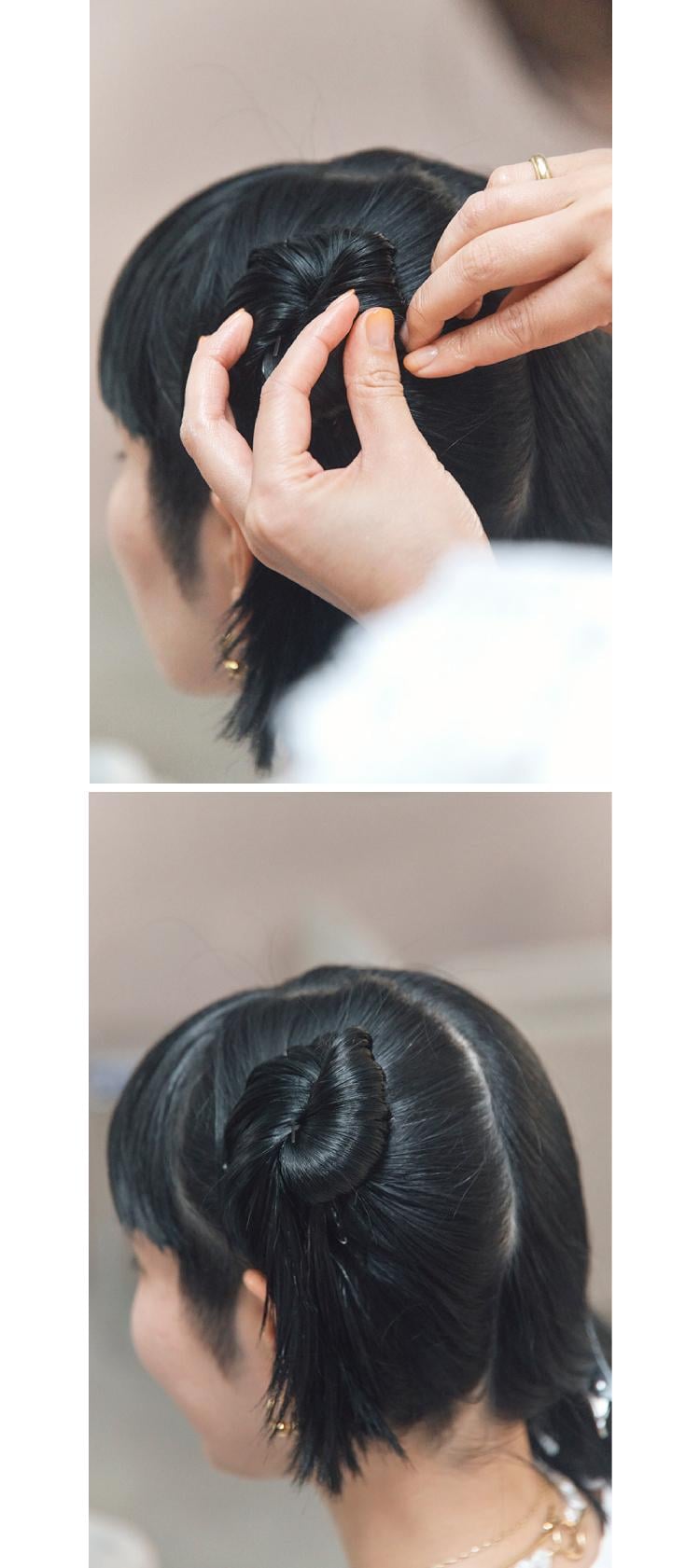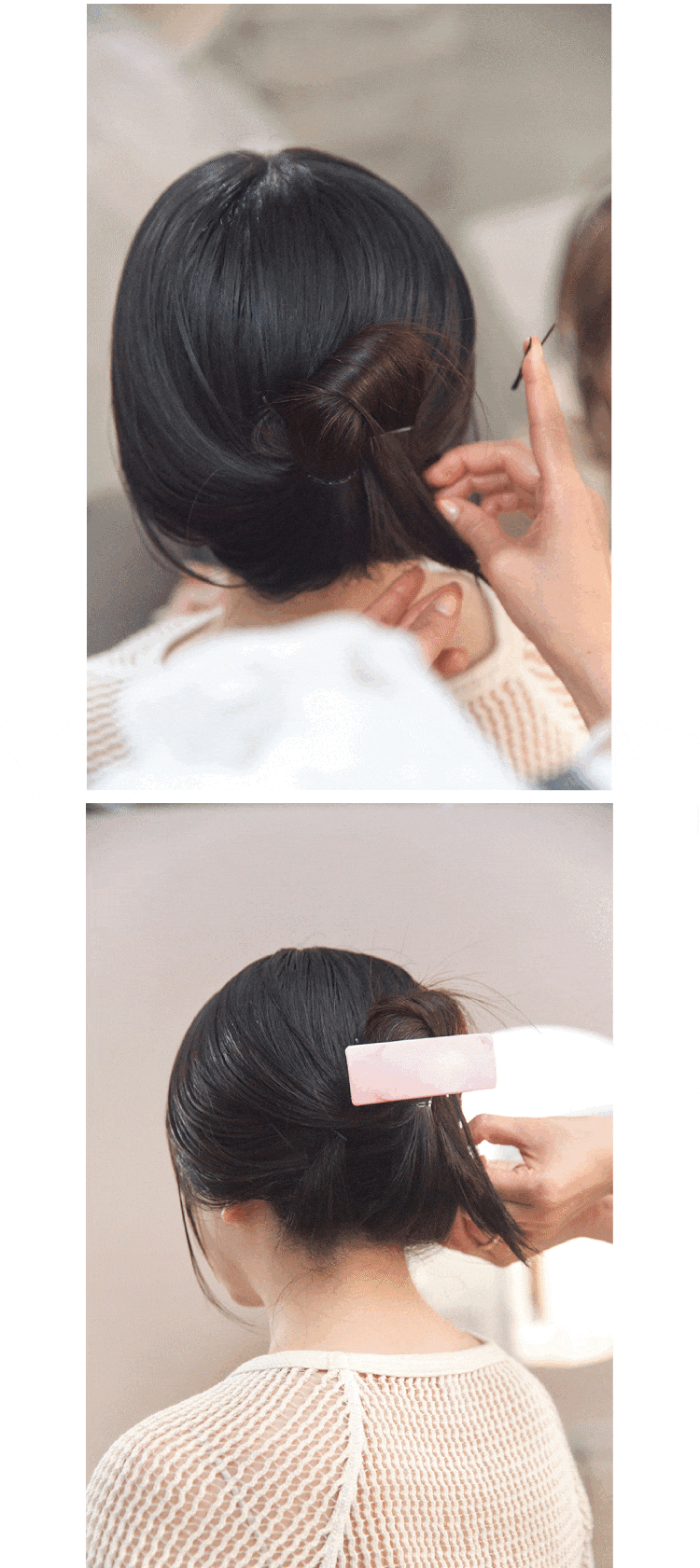 下めの位置でポニーテールをしたら、毛束を軽く捻りながら折りたたむようにピンで固定。襟足部分を少したゆませるのがポイント。結び目の位置にバレッタ、ボリュームが出ている右上にコーム(*7月発売予定)を挿し込む。