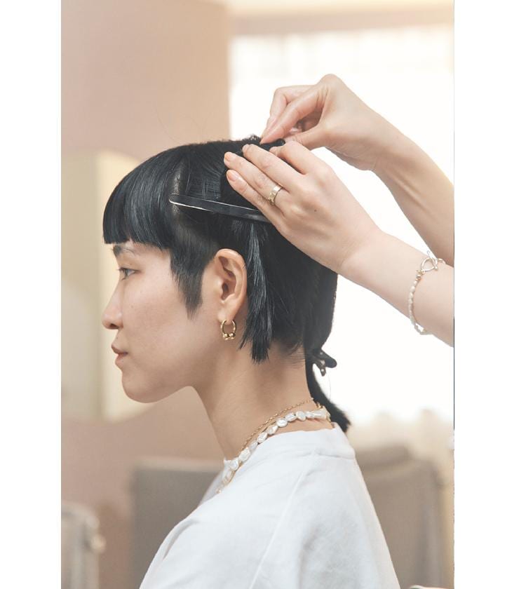 今回はアレンジ用に、ロングヘアだからこそ楽しめる〈KOSTKAMM〉のコーム(*7月発売予定)と共に、色白な肌にも似合う〈RE=COMB(リコーム)〉のバレッタもセレクト。