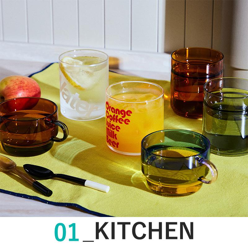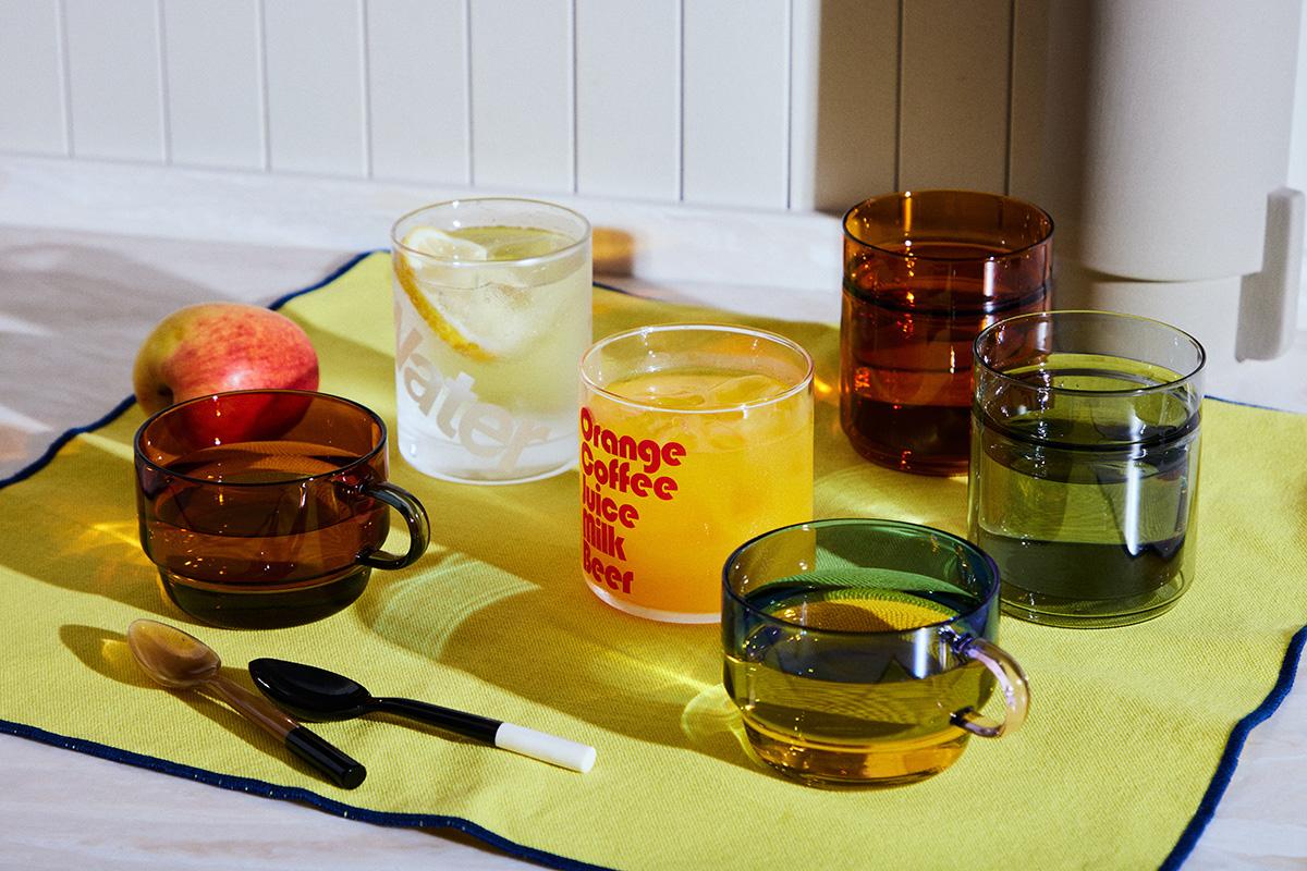 (写真中央)〈Swimsuit Department(スイムスーツ デパートメント)〉のグラスはドリンク名が80年代テイストでプリントされており、パーティーシーンにぴったり。スタンダードな形のロックグラスは安定感があり持ちやすいので、お子様がいる家庭でも活躍しそうです。