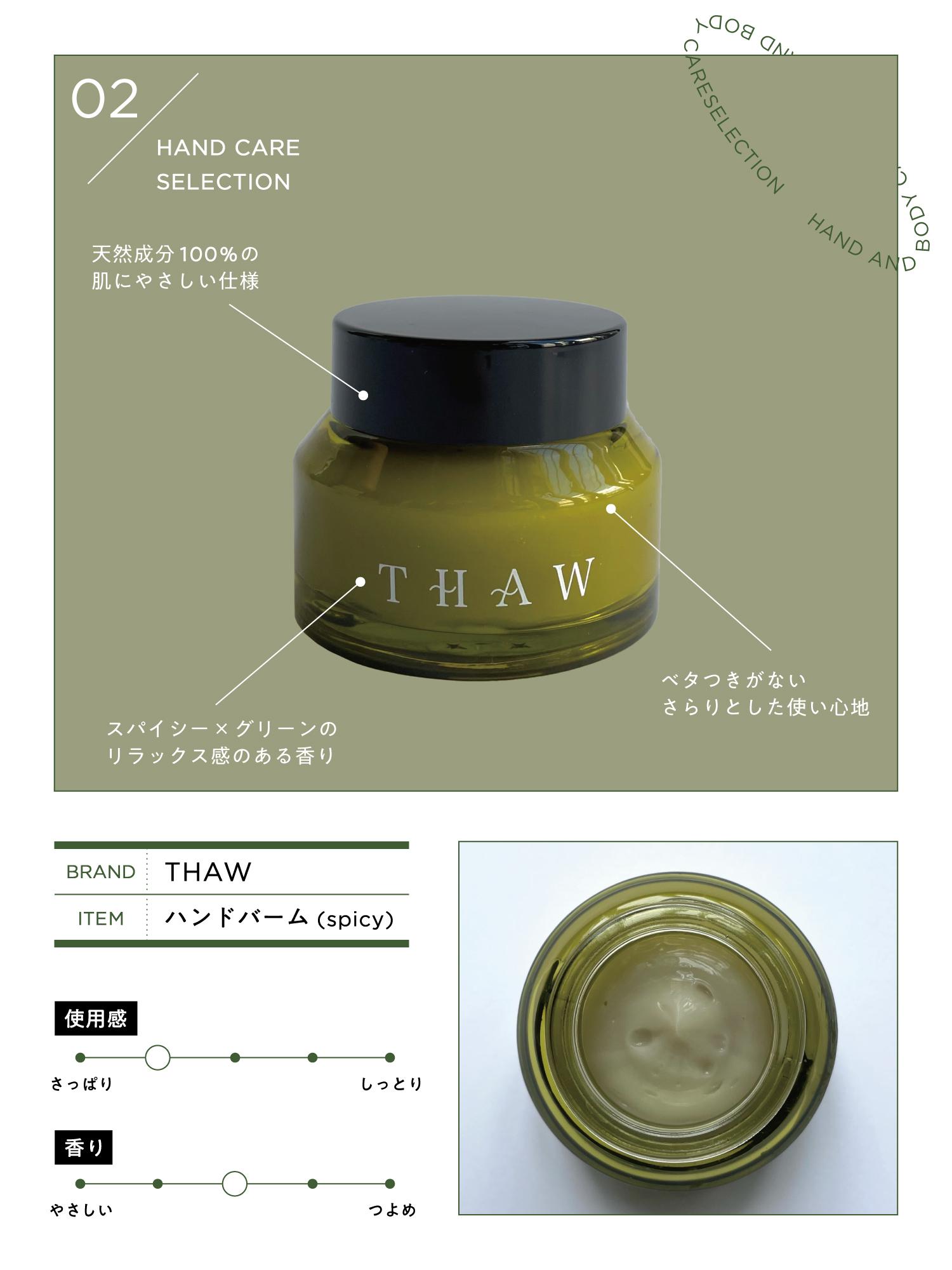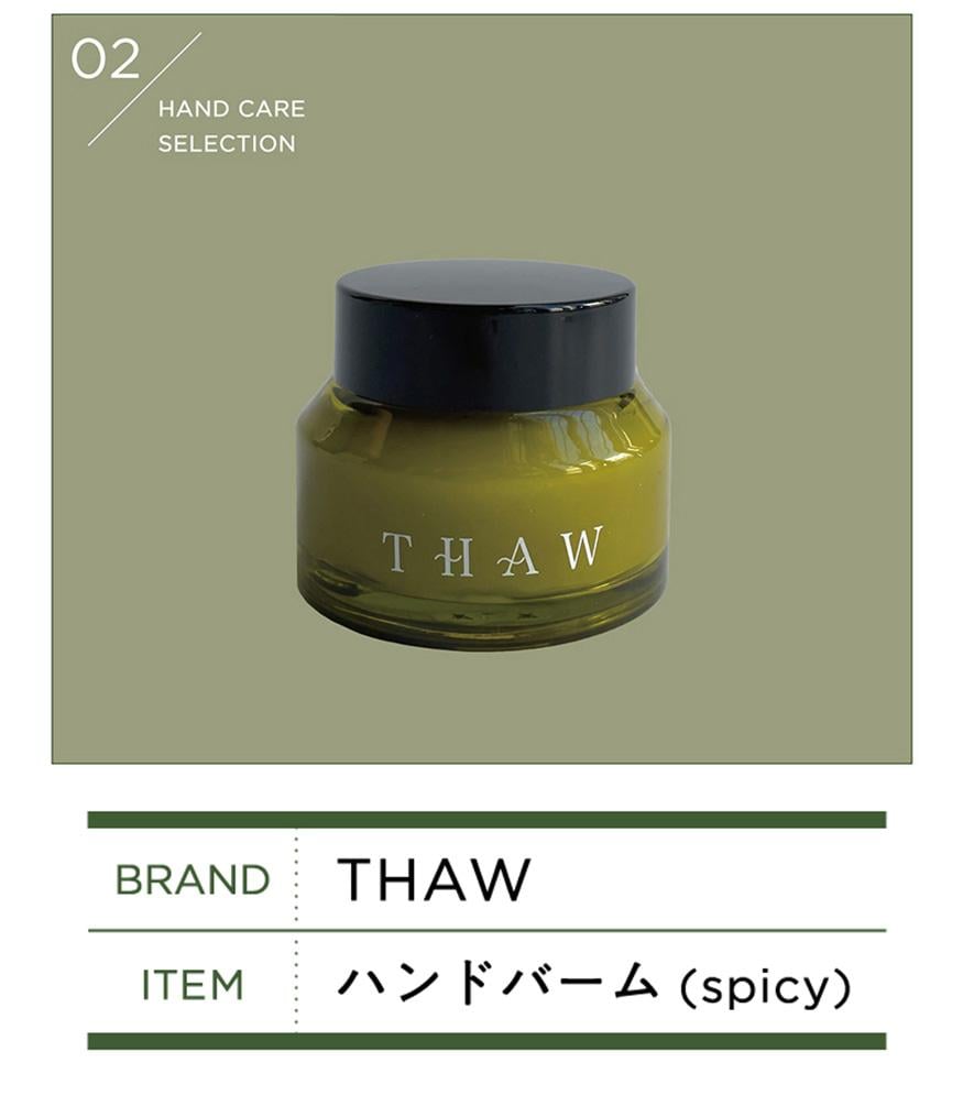 〈THAW〉のバームは、ベタつくことなくさらっとした肌に仕上がるところがお気に入り。高い保湿力とさらりとした使い心地を両立できるところに、思わず感動してしまいました。心安らぐグリーンの香りやジャー入りの可愛らしいルックスも注目したい点。プチギフトとしても喜ばれそうです。