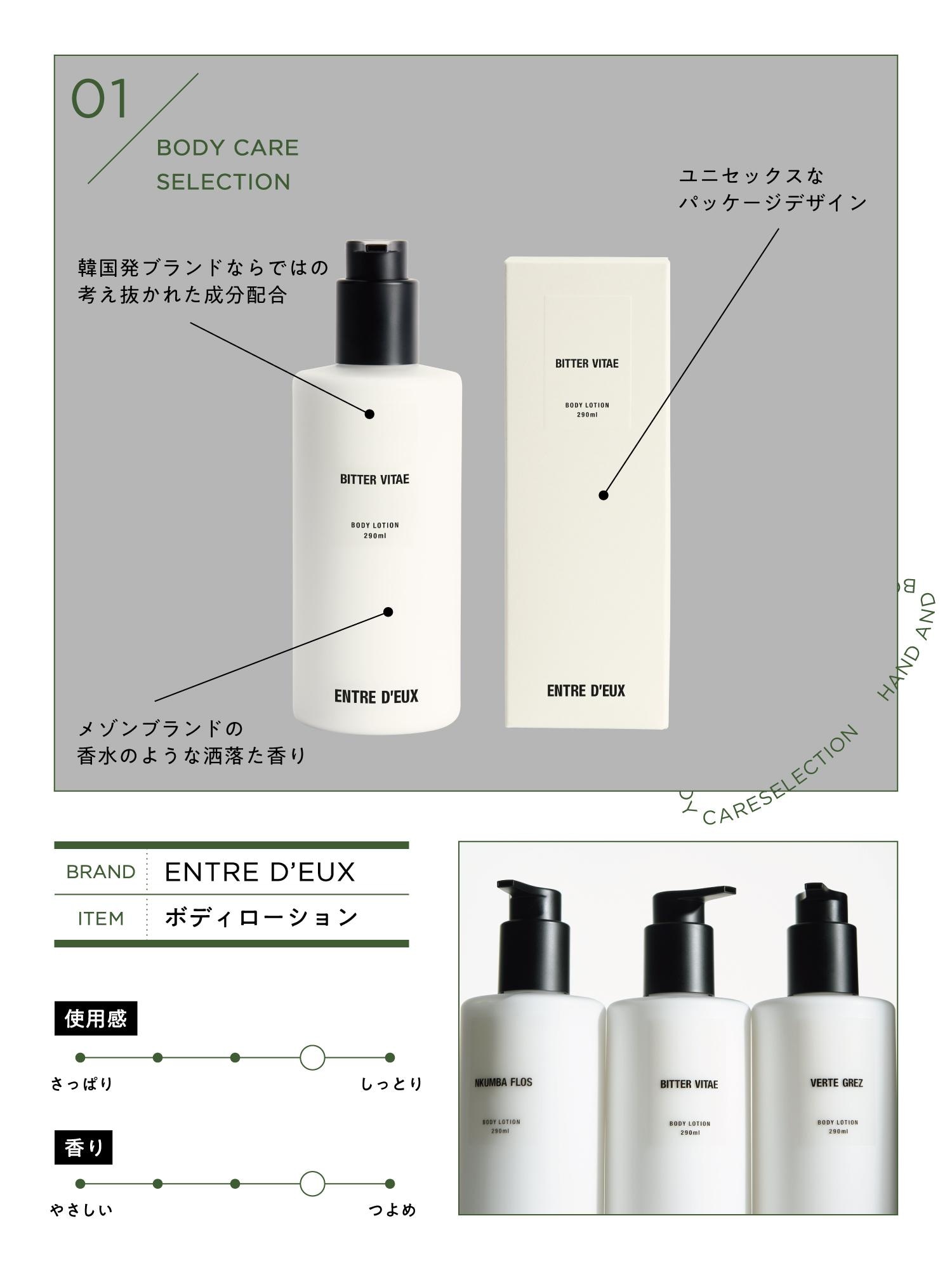 さらりと伸びの良いテクスチャーながら、肌をしっとり保湿してくれるローション。油分と水分を丁度良く補うことができ、なめらかな肌に導いてくれます。何といっても香りが魅力的で、メゾンブランドの香水のような洒落た香りを気軽に纏うことができます。スマートなパッケージデザインも男女問わず愛されるポイント。