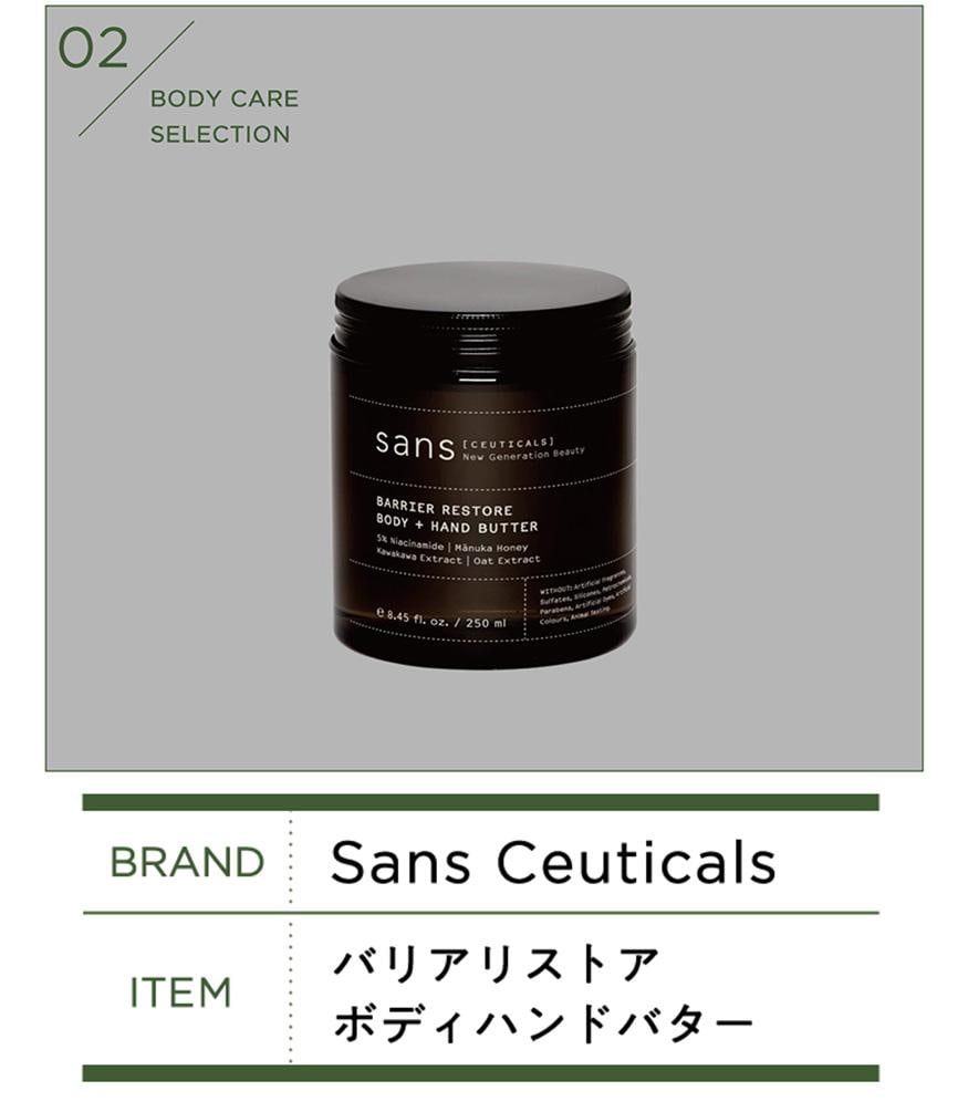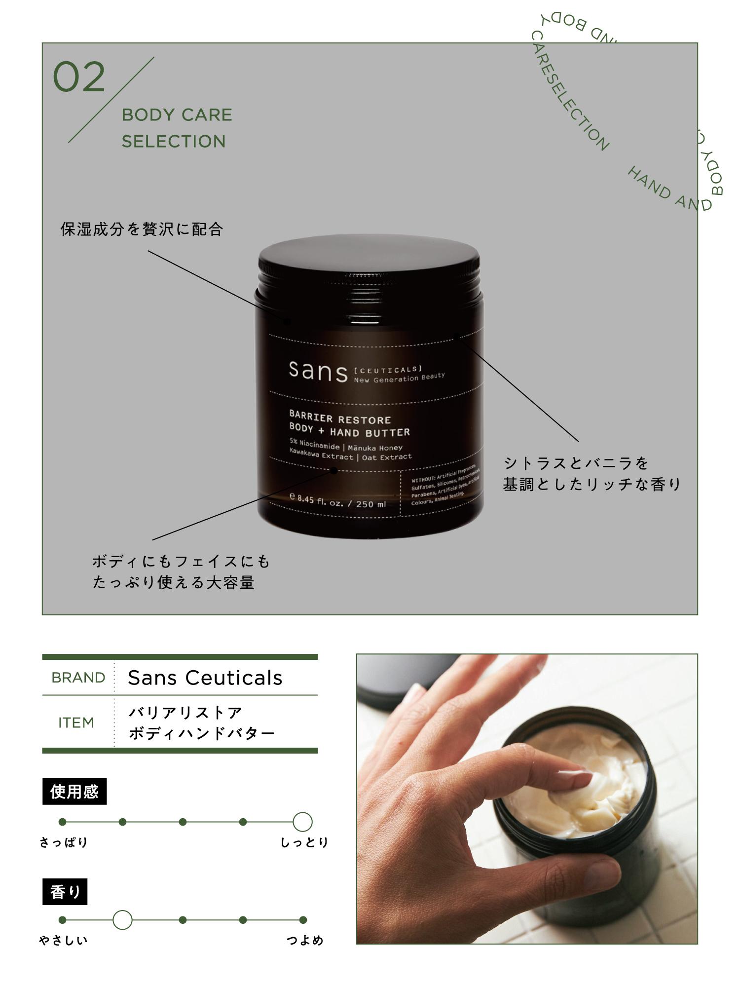 冬はボディクリームを大量に使うので、たっぷりと使える〈Sans Ceuticals〉の卓上タイプのボディバターを愛用しています。なんといっても保湿力が抜群で、夜お風呂上がりに使用すると翌日一日全身がしっとりしています。ほんのりと甘いバニラの香りがシトラスと交じり合い、乾燥する季節にこそ使いたくなる香りです。
