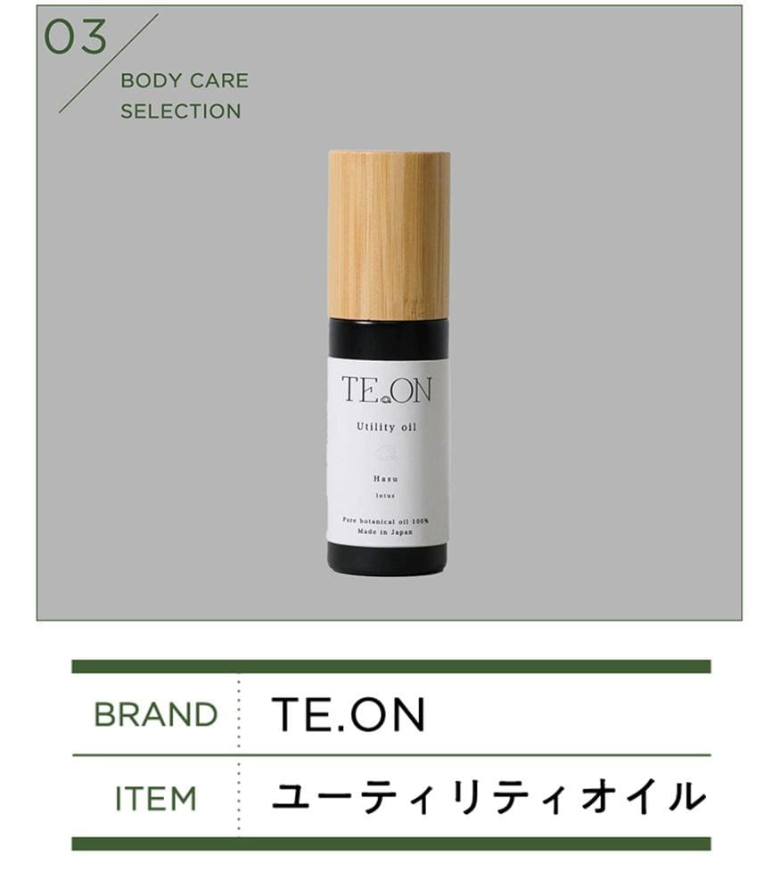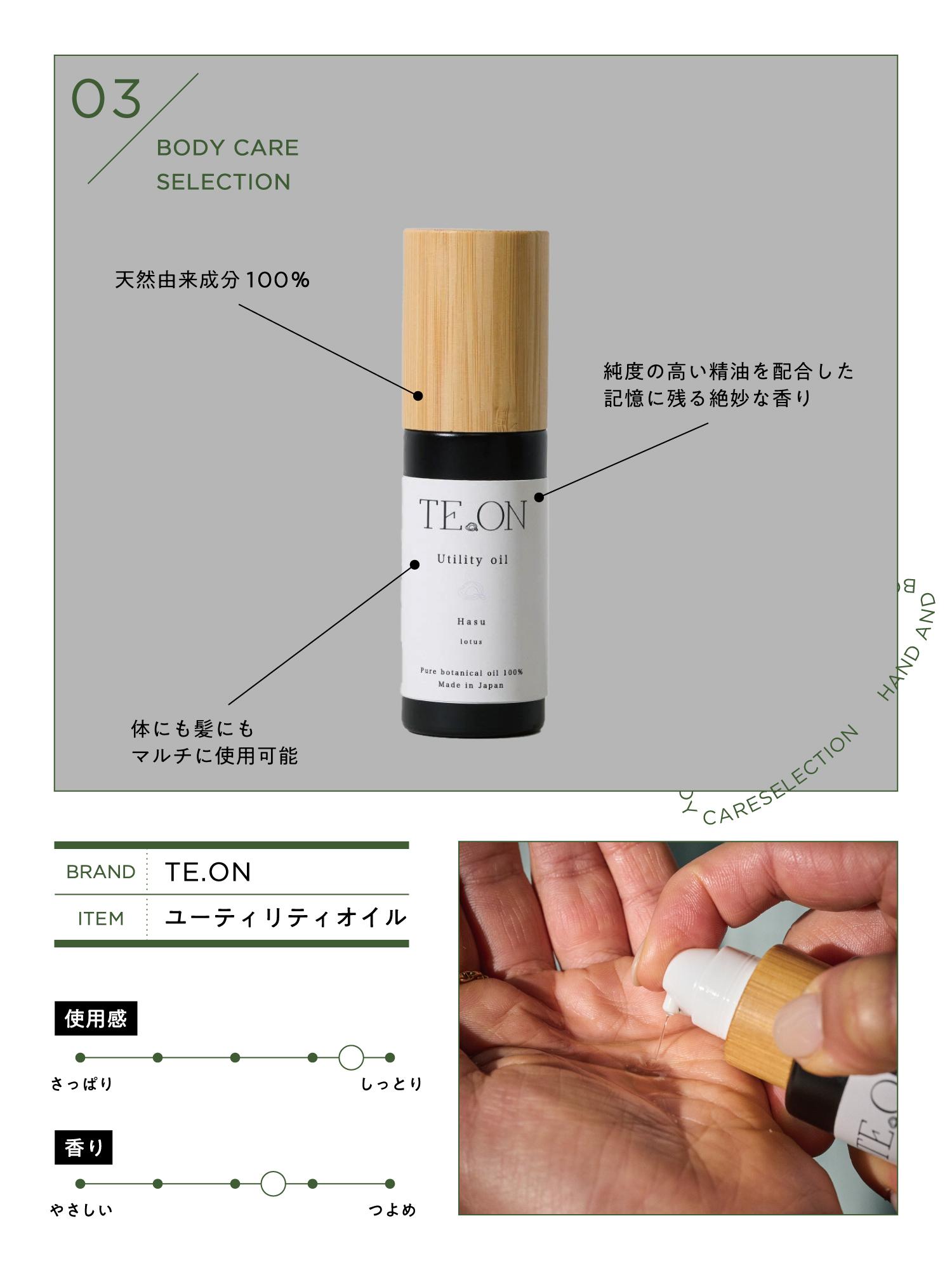 〈TE.ON〉のオイルを初めて使用したときに印象的だったのは、一度嗅いだら記憶に残る香り。純度の高い精油を独自にブレンドした香りは、使うたびに心を穏やかに整えてくれます。体にも髪にもマルチに使用できるところもGOOD。ボディマッサージがてら全身を保湿したり、髪のスタイリングに使用したり大活躍してくれます。