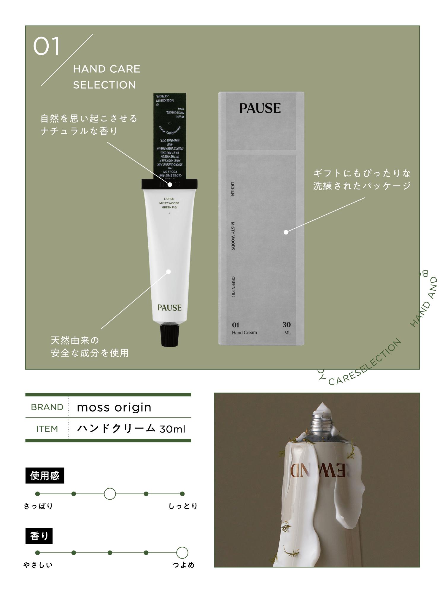 さらりと伸びが良くベタつかず、デスクワーク中に使用するのにもぴったりなテクスチャーです。「PAUSE」はフィグとイチジク、「REWIND」はシダーウッドをベースにした香りで、手元にほんのりと残る香りが心も癒してくれます。洗練されたパッケージとアルミチューブについた折ネームは他にはないデザイン性もあり、男性へのギフトにもピッタリです。