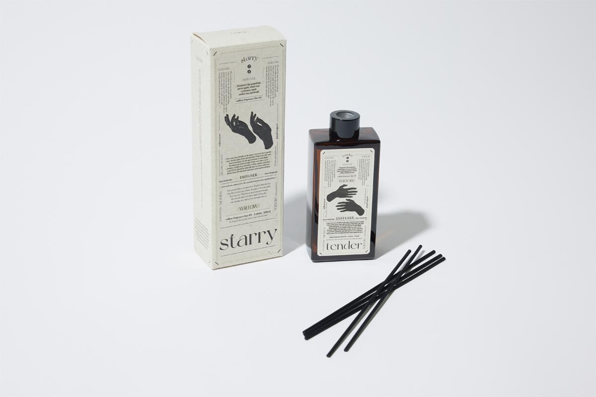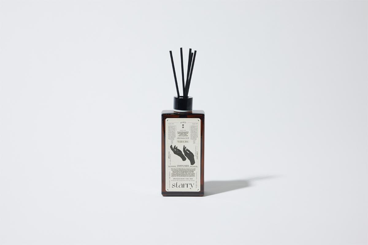 ディフューザーは2種類展開で、私たち日本人にもなじみのあるTEAの香りがインスピレーションとなっています。「starry(02)」はパチュリとアールグレイのようなほんのりとしたティーの香り。心を落ち着かせてくれるので寝室に使用するのにもぴったりです。「tender(01)」はフランキンセンス×ウッディにほうじ茶をブレンドした奥深い香りで、集中力を高めたいときに最適。こちらはリビングやワークスペースでのご使用がおすすめです。湿度や環境にもよりますが、10畳以下のスペースで約1ヵ月~1.5ヵ月ほど香りが持続します。