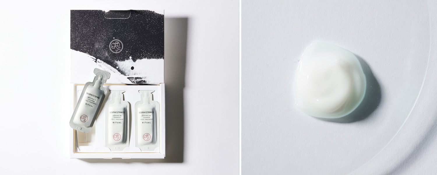 日常とは違う環境で過ごす、旅行や出張での滞在先。いつものスキンケアルーティンがままならないだけでなく、慣れない環境によるストレスも気になりますよね。そんなときにおすすめなのが、〈SOPHISTANCE(ソフィスタンス)〉のリチュアル。個包装になっているから、清潔なまま持ち運ぶことができ、荷物としてもかさばらない優秀さです。使い方は、ナイトマスクを塗りマッサージをしながら馴染ませたら、そのまま就寝するだけ。ナギイカダ根のエキスが肌を引き締め、顔立ちの美印象へと導くだけでなく、むくみや血行が気になる旅先でのコンディションもサポート。米、柚子、林檎の成分が肌へハリとツヤを与え、セラミドと異性化糖(ペンタバイティン)が肌をじっくりと保湿していきます。