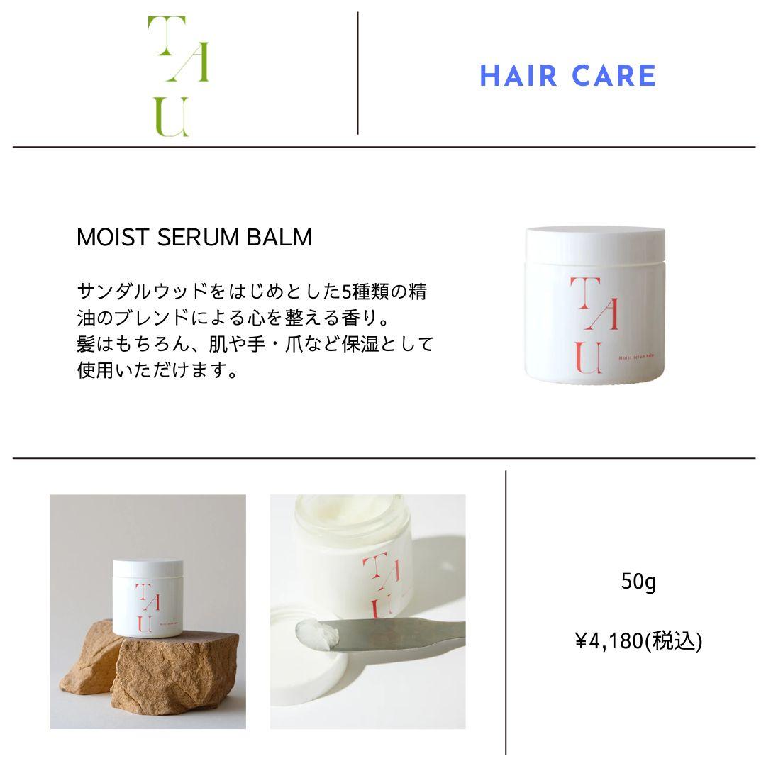 ヘアにもボディにもマルチに使えるバームですが、私は毎朝のスタイリングに使っています。毎朝仕事へ行く前に〈TAU〉のプロダクトの香りをかぐと、気持ちが自然に前を向く気がしています。固めのテクスチャーですが、肌の上でやわらかくなめらかに溶けていくので、不器用な私でも扱いやすいところもお気に入りのポイント。