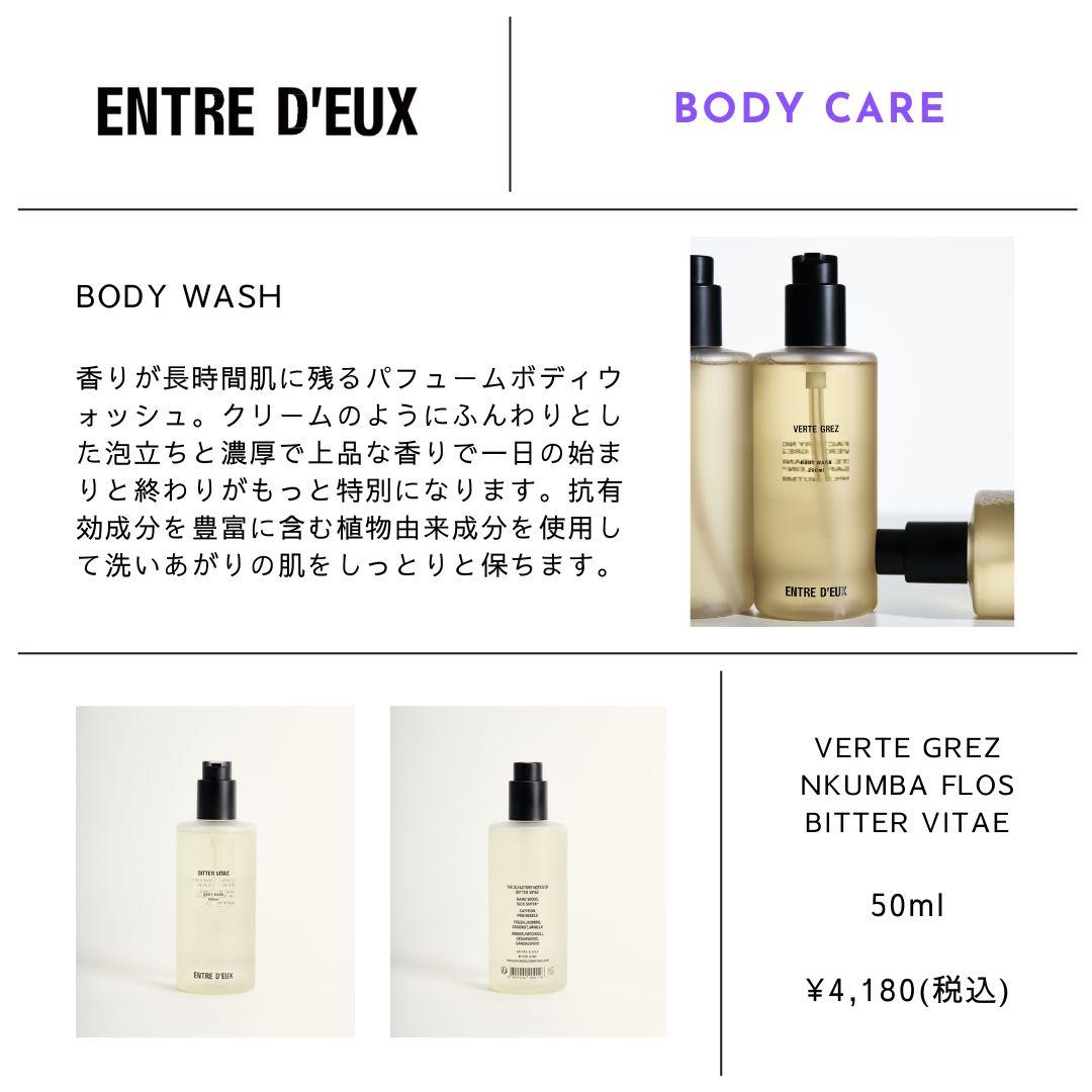 中身は韓国・ソウルで開発され、深く奥行きのある香りはフランスで調香されている〈ENTRE D’EUX〉のボディウォッシュ。「パフュームボディウォッシュ」という名前の通り、濃厚な香りがバスルーム中に広がって、リラックス空間にしてくれるアイテムです。ホホバオイルやアボカドオイルなどが含まれているので、洗い上がりはしっとり。ウォッシュだけでも長い時間、肌にほんのりと香りを残してくれます。
