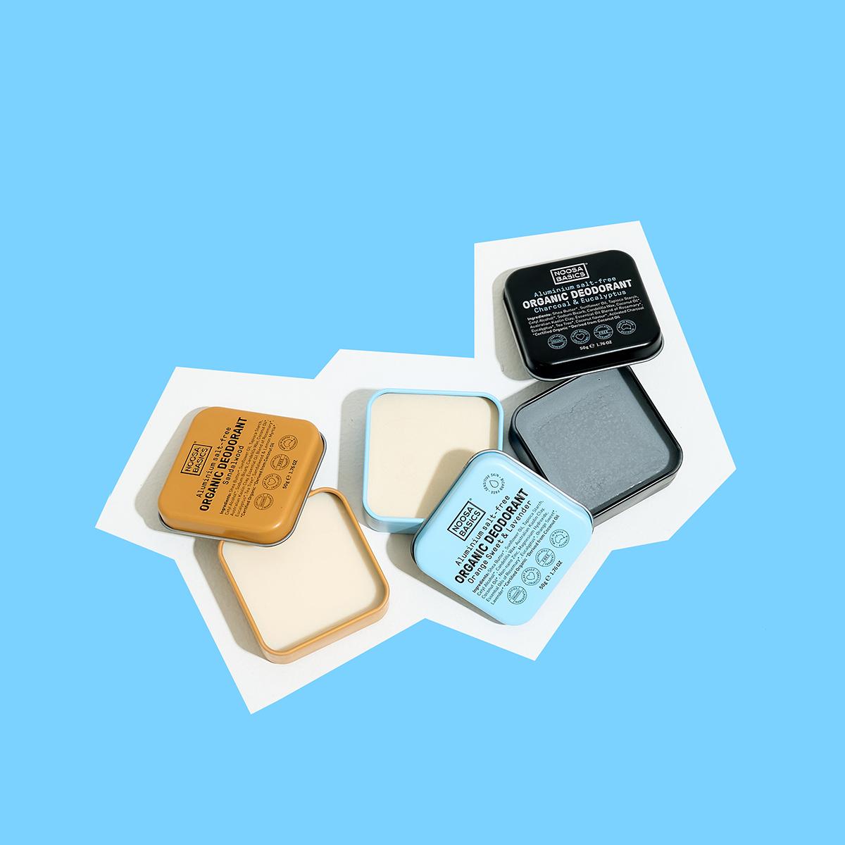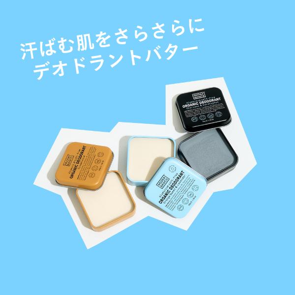 キャンディ缶のようにキュートな見た目のこちらは、夏のニオイ&ベタつきには欠かせない〈NOOSA BASICS(ヌーサベーシックス)〉のデオドラントバター。伸びが良く、お肌にクルクルと馴染ませるとさらさらパウダリーな質感に。敏感肌のために手作りされたナチュラルな処方で、タピオカパウダーやカオリンクレイなどの成分が汗やにおいにアプローチします。「スウィートオレンジ&ラベンダー(48)」(写真中央)や「サンダルウッド(70)」(写真左)など、デオドラントアイテムでは珍しい天然精油の香りも特徴です。