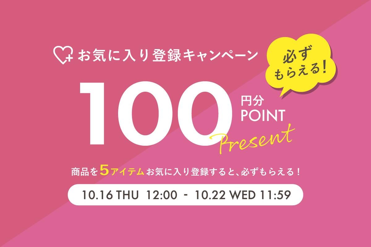 キャンペーン期間中に、新たにお気に入り商品を5アイテム以上登録していただいたお客様にもれなく100ポイントをプレゼント! ポイント付与後、1ポイント1円からご利用いただけます。