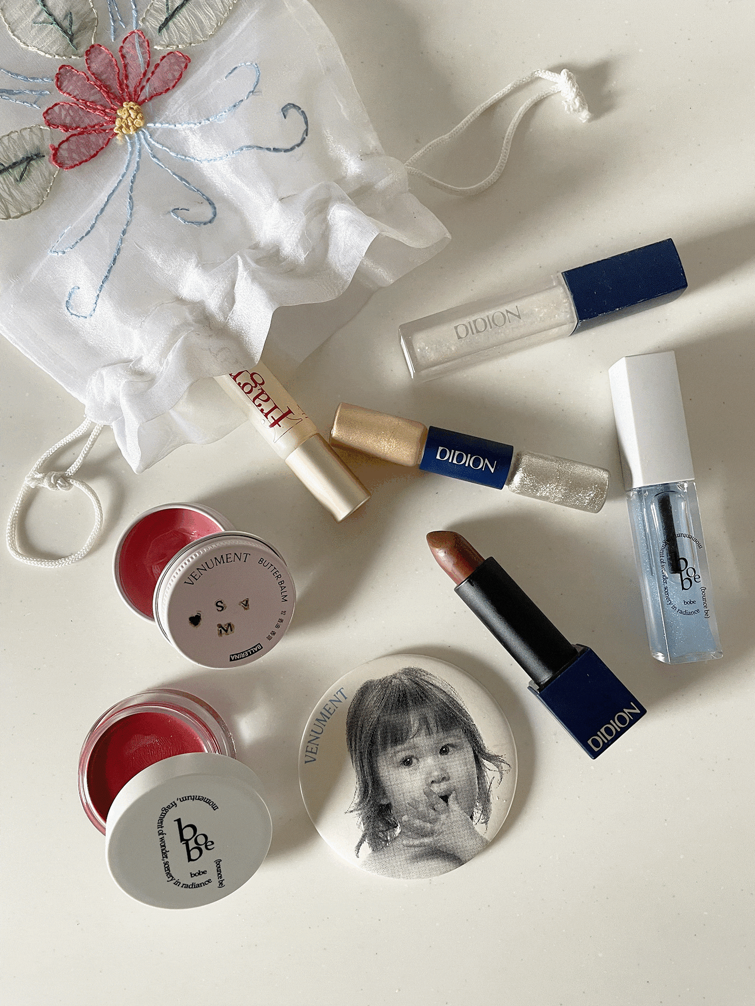 もちろん、持ち歩くものはすべてお気に入りですが、その中でも、手軽に季節感をプラスできる〈DIDION〉のリップ「Sparkle Neutral」と、クリアブルーでトレンド感満載のうるツヤリップに仕上げてくれる〈bobe〉の「プランパーオイルグロス」が、今の気分です。秋冬は、やっぱりこっくりカラーやラメ、ツヤを取り入れたくなりますね!