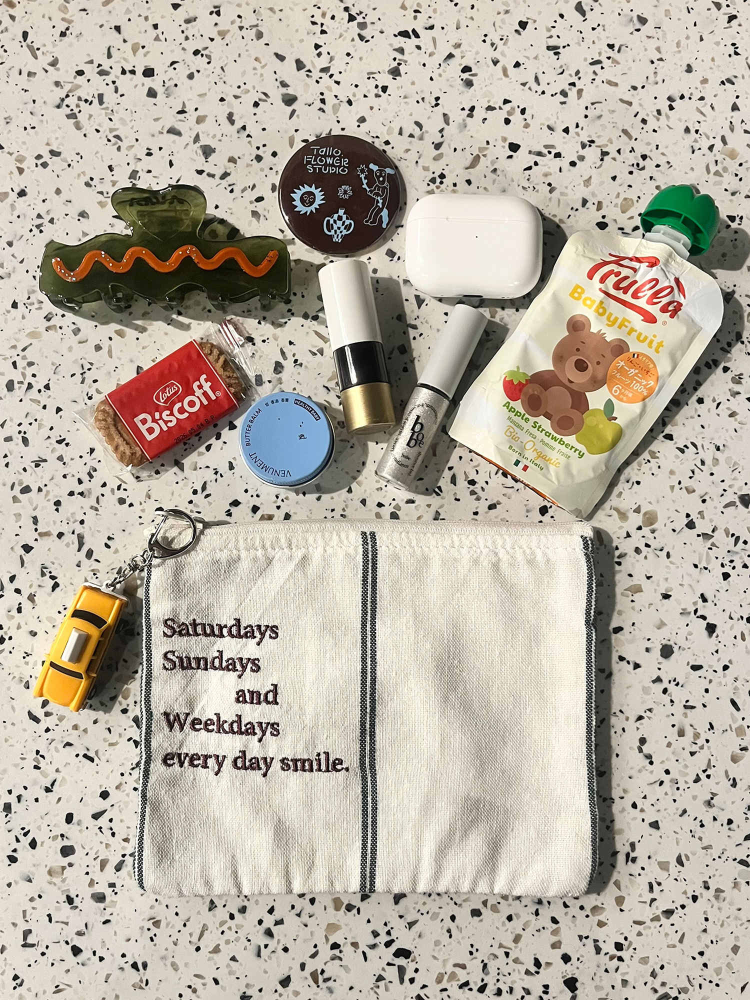 〈beej〉のポーチは、ちょうどいいサイズ感が特にお気に入り。見た目はフラットでコンパクトですが、実際に使ってみると想像以上に収納力があり、「こんなに入るんだ!」と驚きました。 子どもがぐずったとき用のお菓子も、自分用のコスメも、細々としたものをごそっとまとめて入れられます。内ポケットがついているのも嬉しいポイントで、絆創膏など迷子になりがちな小物の収納にも便利です。
