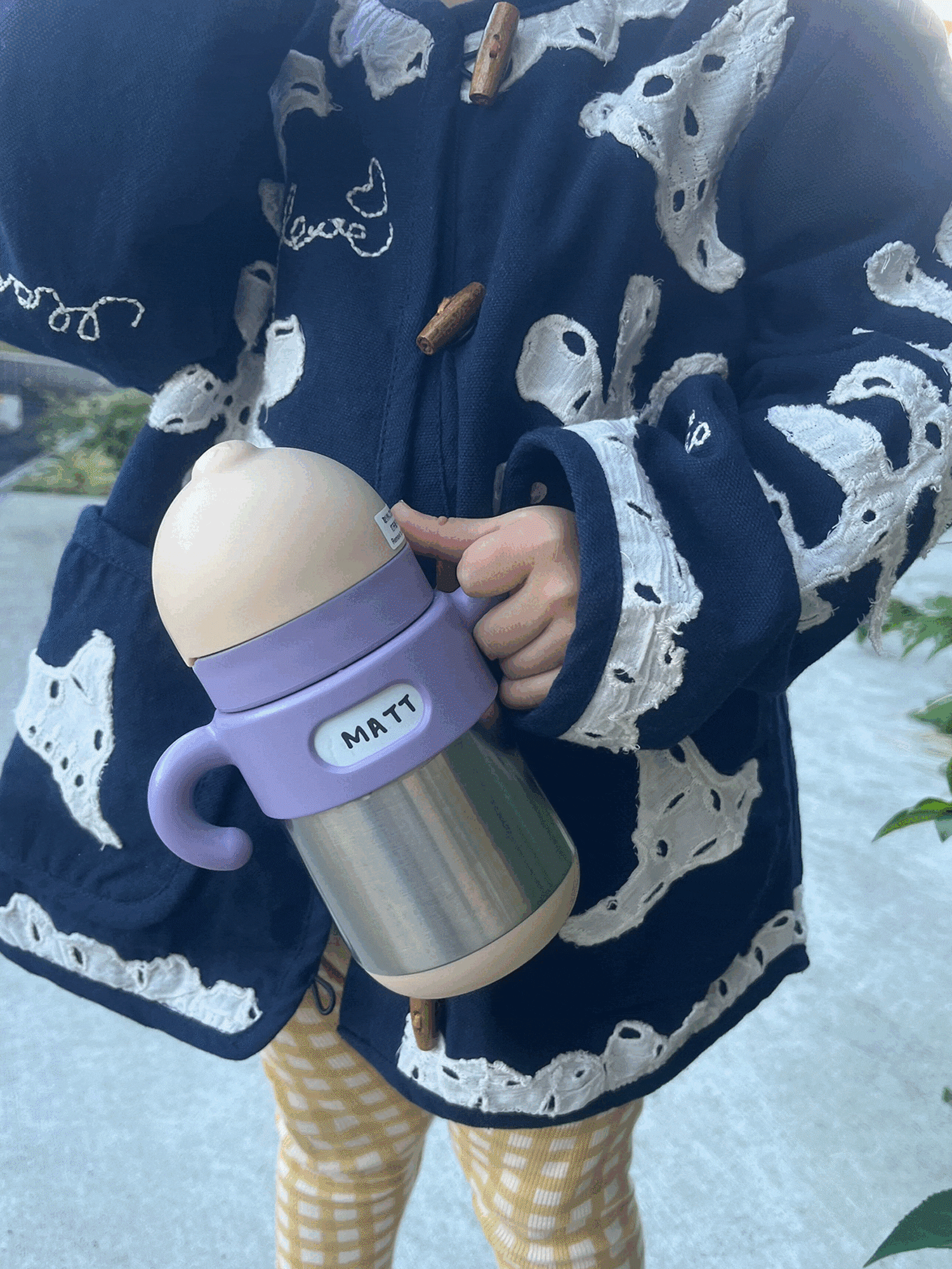 〈meroware〉のサーモボトルは、保冷・保温ができるうえ、ストローに逆流防止弁がついているので、下に向けてもドリンクが漏れないのが嬉しいポイント。分解して洗えるため、いつでも清潔に使えます。子どもの小さな手でも持ちやすいハンドル付きで、安心感もバッチリ。