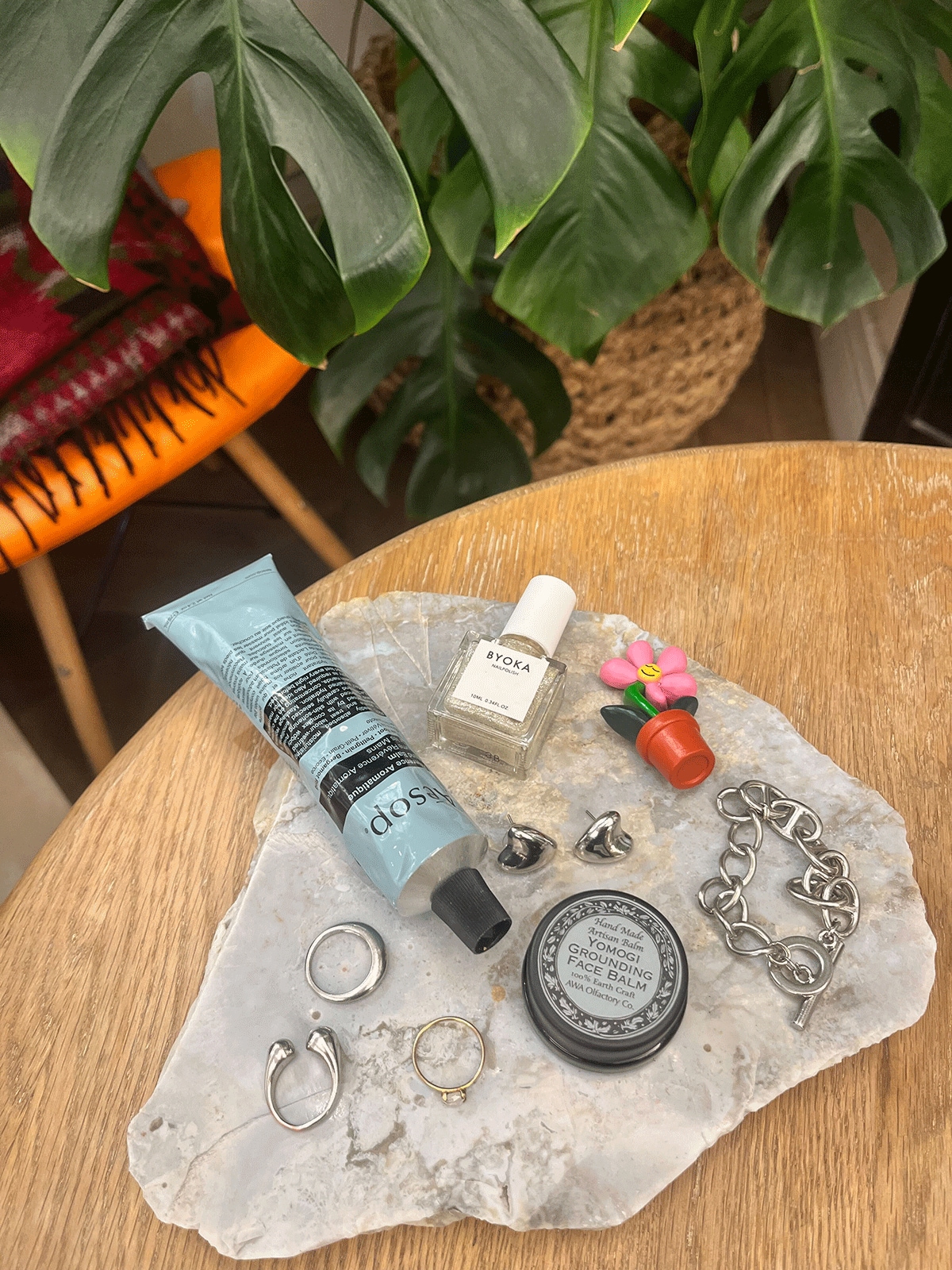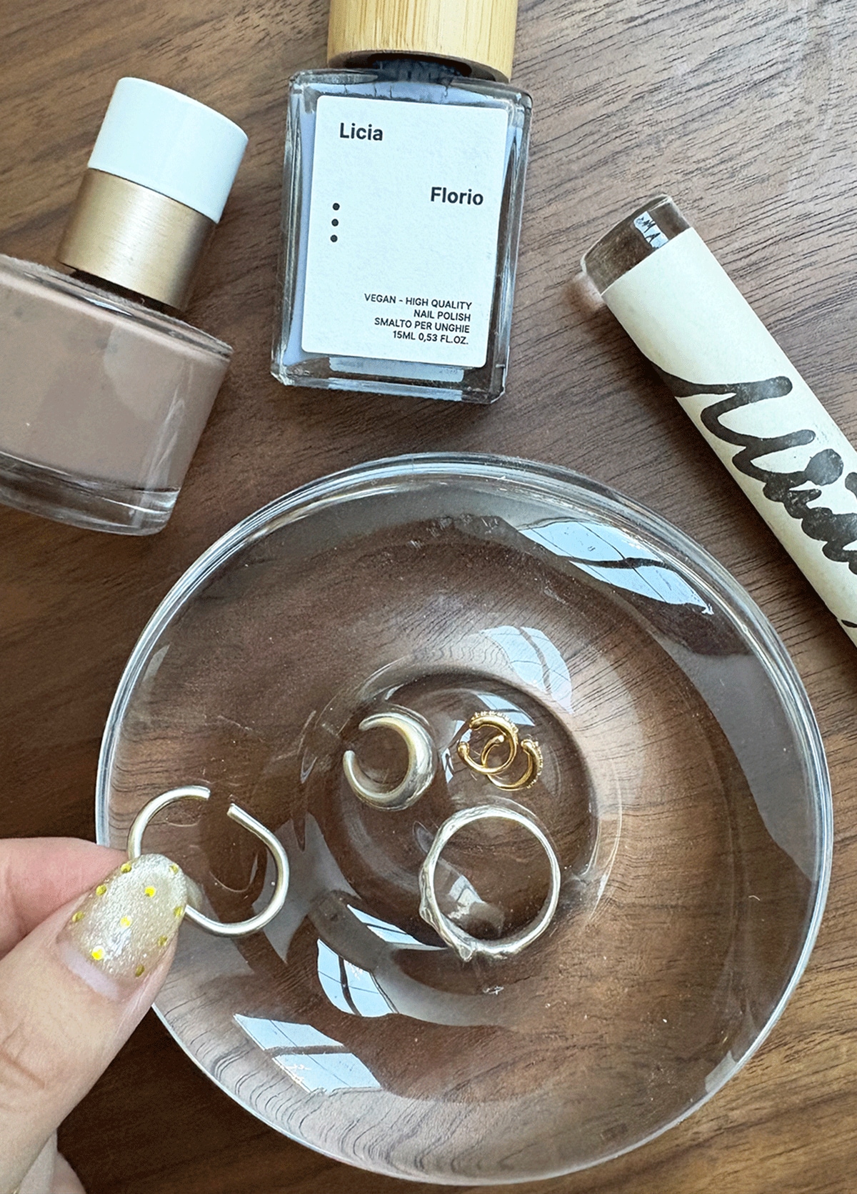 大きめのプレートなので、ごちゃごちゃしたアクセサリーだけでなく、お出かけ前に欠かせない保湿ケアアイテムも一緒に置いたり、そこにちょこんとお気に入りのガチャを飾ってみたりと、置くものによって雰囲気を変えられるのも嬉しいです。