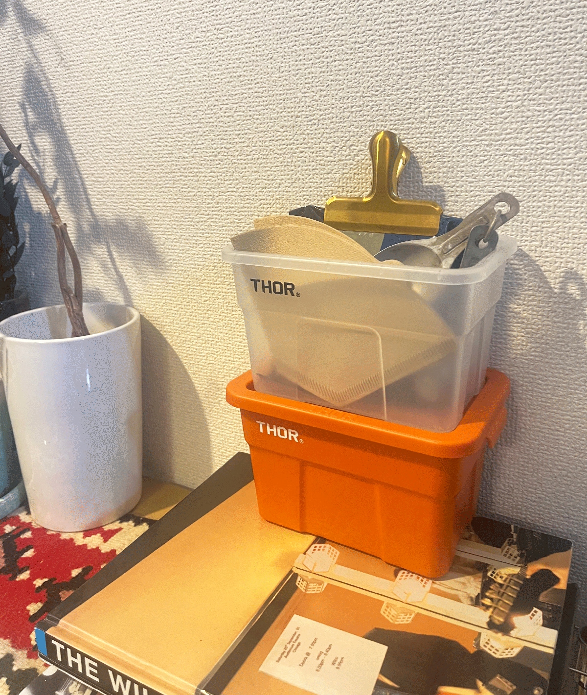 ケーブル類などテーブルに出しっぱなしになっていた細々したものをまとめるのにぴったりだと思い購入したのが、〈THOR〉のミニトートボックス。THORの大型コンテナをそのままミニサイズにしたデザインが可愛くて、私はオレンジとクリアの2色買いをしました!
