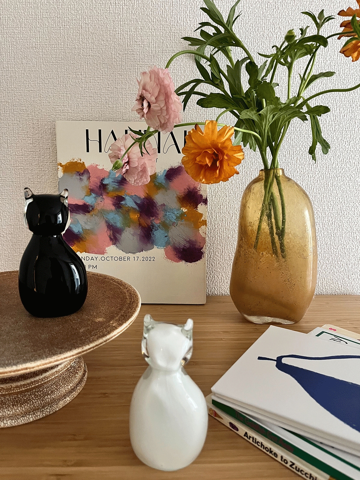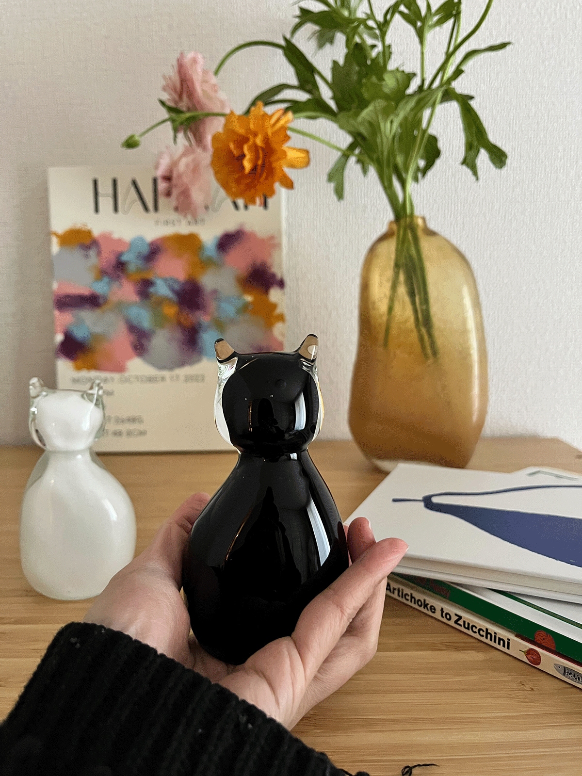 猫アイテムを見つけると、可愛くてついつい手に取ってしまうのですが、そんな中でも〈HERE by DETAIL〉のCatオブジェは、ガラスでありながら丸みを帯びたやわらかいシルエットがなんとも愛おしく、家にお迎えしました。
