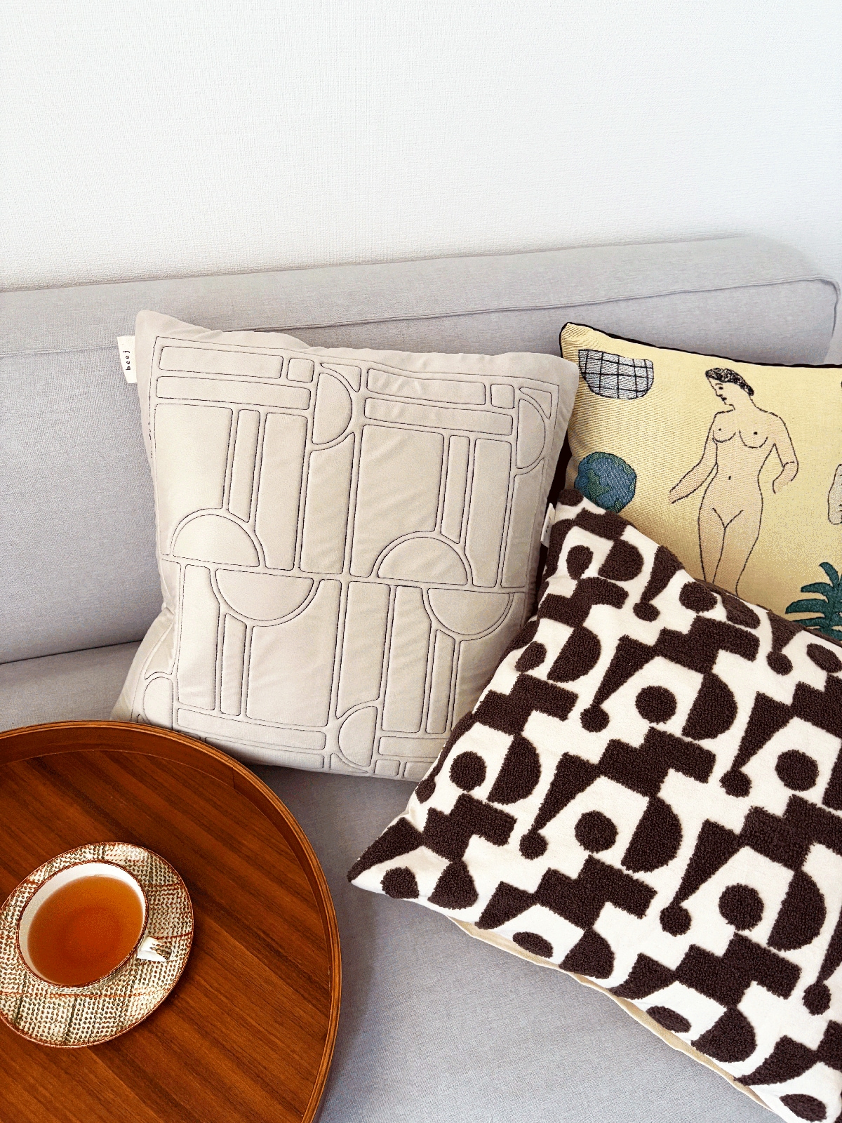 「Geometric Cushion Cover」は、キャンバス生地にモコモコと立体感のある刺繍を施した一枚。幾何学模様のデザインが甘さを程よく抑え、空間をきりっと引き締めてくれます。